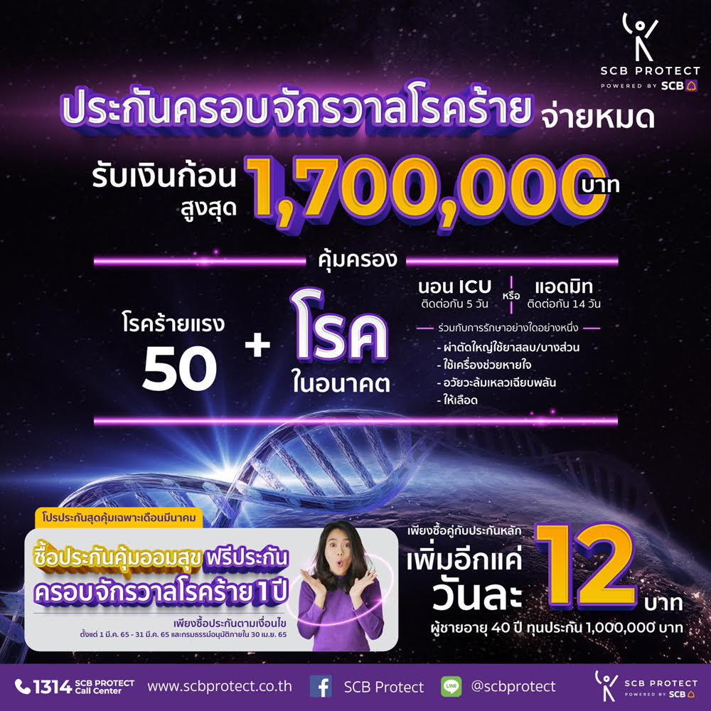 ไทยพาณิชย์ โพรเทค ส่งประกันไฮไลต์แห่งปี “ประกันครอบจักรวาลโรคร้าย” คุ้มครอง 50 โรคร้ายแรงในปัจจุบันและโรคเข้าข่ายรักษาที่กำหนด ตรวจเจอรับเงินก้อนหลักล้านทันที ตั้งเป้าหนุนพอร์ตประกันสุขภาพโต 100% อัดโปรแรงเดือนมีนาคม มอบประกันครอบจักรวาลโรคร้ายฟรี 1 ปี เมื่อซื้อคู่กับประกันสะสมทรัพย์ที่กำหนด