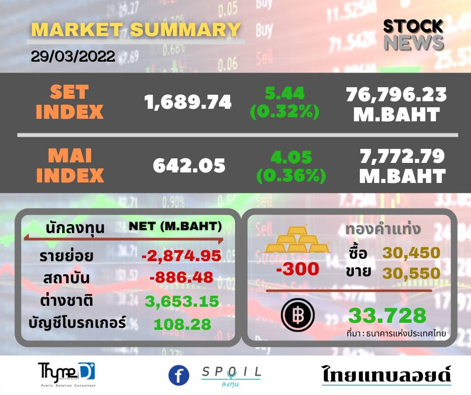 ตลาดหลักทรัพย์ ปิดวันนี้ที่ระดับ 1,689.74 จุด เพิ่มขึ้น 5.44 จุด (+0.32%) มูลค่าการซื้อขาย 76,796.23 ล้านบาท
