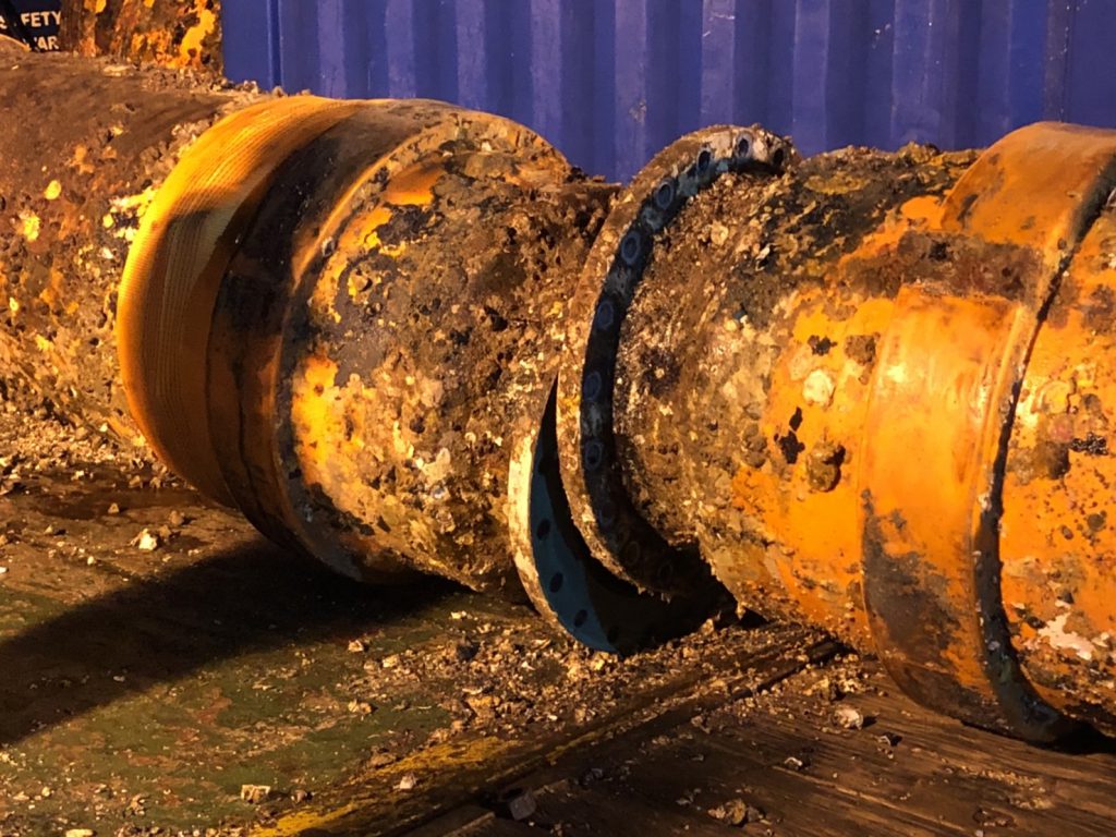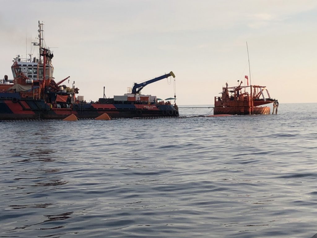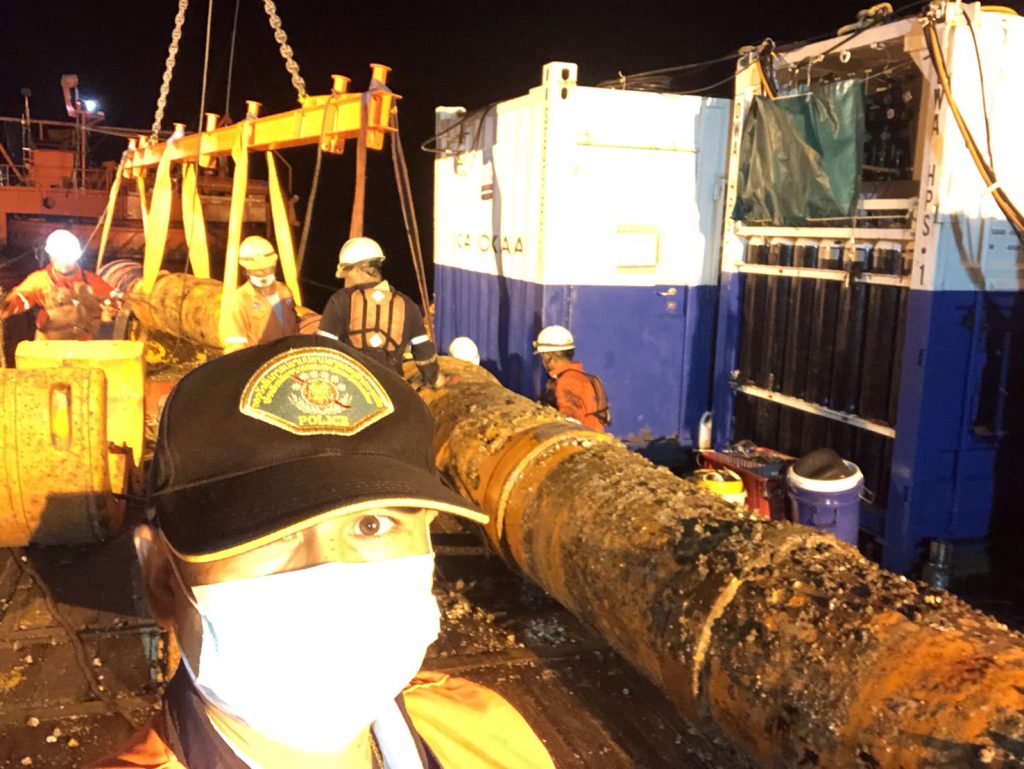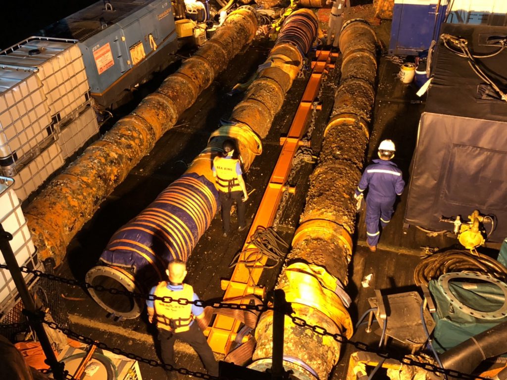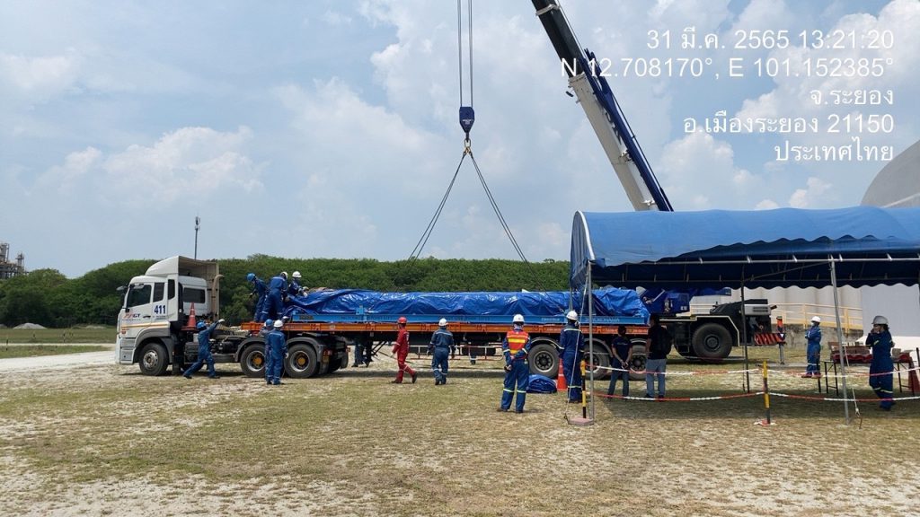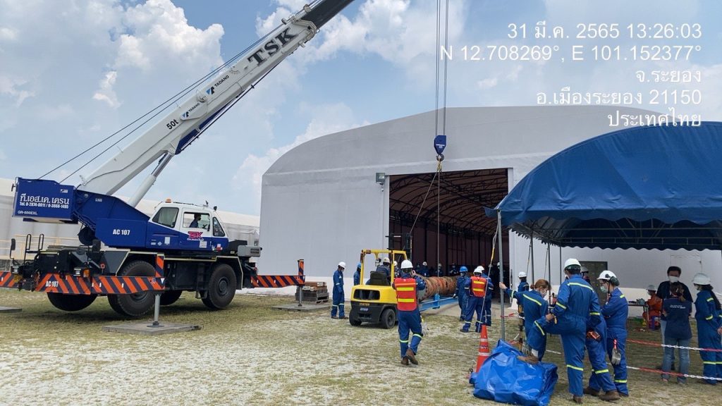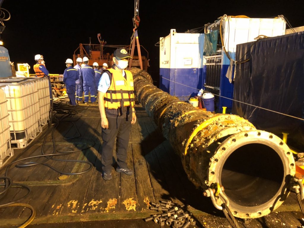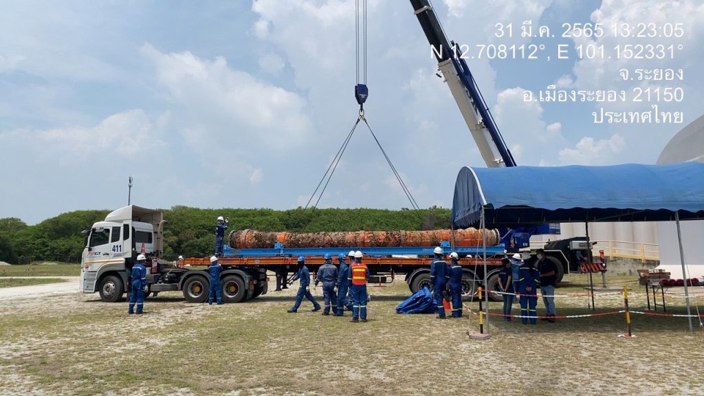 ทั้งนี้ได้เข้า ร่วมประชุมสังเกตการณ์ ปฏิบัติการนำท่อฝั่งตะวันออก E2, E2 และ E3 ขึ้นจากนำ้ ที่ทุ่นกลางทะเล SPM โดยช่างเทคนิค บริษัทสตาร์ ปิโตรเลียมฯ ได้ดำเนินการตามแผน ขั้นตอนปฏิบัติดังนี้ ได้ทำการถอดหน้าแปลน E1 ส่วนยึดติดกับทุ่น และ E3 ส่วนยึดติดกับท่อใต้ดิน จากนั้นเป็นขั้นตอนการไล่น้ำออกจากท่อ เพื่อให้อากาศแทนที่ และทำให้ท่อลอยขึ้นผิวนำ้ ช่าวเทคนิคได้ดันท่อ E1 ขึ้นผิวนำ้สำเร็จเวลา 02.00 น. ต่อจากนั้น 02.00 น. ได้เริ่มนำท่อ E1 ขึ้นท้ายเรือ และทยอยนำท่อ E2 และ E3 ขึ้นท้ายเรือตามลำดับ โดยท่อน E3 ซึ่งมีรอยแตกรั่วนั้นได้ใช้คานเหล็กเสริมยกขึ้นเรือเสร็จสิ้นเวลา 05.00 น. จากนั้นได้นำท่อเข้าฝั่งท่าเรือมาบตาพุด ถึงฝั่งประมาณ 07.00 น. ทั้งนี้ได้ให้เจ้าหน้าที่ตำรวจจาก ปทส., เจ้าหน้าตำรวจพิสูจน์หลักฐาน พนักงานสอบสวน สภ.มาบตาพุด ได้อยู่เฝ้าสังเกตการณ์ก่อนช่วงเทึ่ยงคืน ซึ่งพบอุปสรรค์งานถอดท่อล่าช้ากว่ากำหนดการ เนื่องจากน้ำใต้ทะเลแรงกว่าที่ประเมินใว้ แต่สามมารถนำท่อทั้งหมดขึ้นฝั่งได้เป็นที่เรียบร้อย “สำหรับขั้นตอนต่อไปเป็นการนำท่อไปเก็บยังโกดังชั่วคราว เพื่อรอลากเข้า ศูนย์เทคโนโลยีโลหะและวัสดุแห่งชาติ (MTEC) เพื่อกำหนดนัดวันเข้าตรวจสอบพิสูจน์ ถึงสาเหตุร่วมกัน” พล.ต.อ.รอย กล่าว