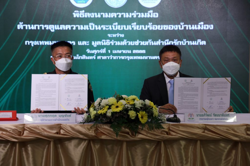 นายศุภกฤต บุญขันธ์ ผู้อำนวยการสำนักเทศกิจ กล่าวว่า กรุงเทพมหานคร ได้ลงนามบันทึกความร่วมมือ (MOU) ในการดูแลความเป็นระเบียบเรียบร้อยของบ้านเมือง ร่วมกับมูลนิธิร่วมด้วยช่วยกันสำนึกรักบ้านเกิด มีเป้าหมายเพื่อบูรณาการให้การปฏิบัติงานร่วมกันอย่างเป็นแบบแผน พัฒนาความร่วมมือด้านการให้บริการสาธารณะ เสริมสร้างความรู้ เพิ่มพูนทักษะให้กับเจ้าหน้าที่และอาสาสมัครร่วมด้วยช่วยกัน ในการจัดระเบียบดูแลความเรียบร้อยของบ้านเมือง ดูแลความปลอดภัยในชีวิตและทรัพย์สินให้กับประชาชน