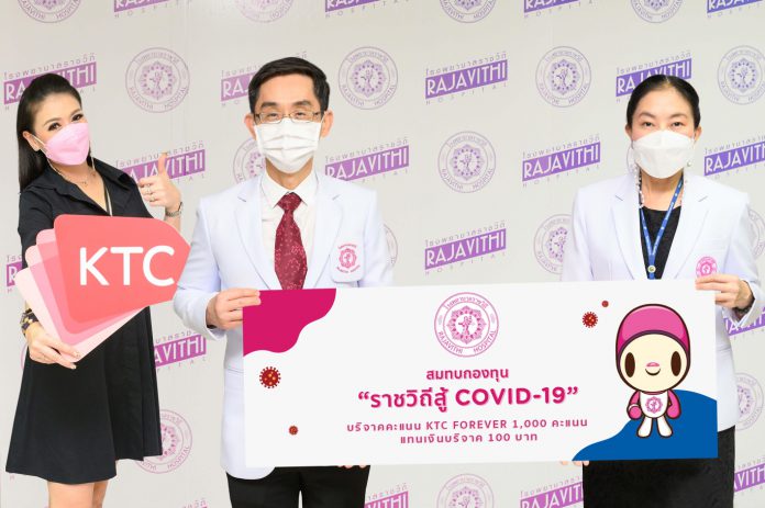 นายแพทย์จินดา โรจนเมธินทร์ (กลาง) ผู้อำนวยการ โรงพยาบาลราชวิถี ร่วมกับ “เคทีซี” หรือ บมจ.บัตรกรุงไทย ชวนสมาชิกบัตรเครดิตเคทีซีร่วมบริจาคเข้ากองทุน “ราชวิถีสู้ COVID-19” เพื่อสมทบทุนซื้อเครื่องมือและอุปกรณ์การแพทย์ที่จำเป็น สำหรับผู้ป่วย COVID-19 ที่เข้ารับการรักษาตัวที่โรงพยาบาลราชวิถี โดยสามารถร่วมบริจาคคะแนน KTC FOREVER 1,000 คะแนน แทนเงินบริจาค 100 บาท ผ่าน 3 ช่องทาง ได้แก่ KTC PHONE 02 123 5000 กด 0 / แอปฯ KTC Mobile / SMS พิมพ์ RVT วรรค ตามด้วยหมายเลขบัตรเครดิต 16 หลักส่งมาที่ 061 384 5000 ตั้งแต่วันที่ 1 มกราคม 2565 – 31 ธันวาคม 2565 โดยผู้บริจาคสามารถนำใบเสร็จจากการบริจาคไปใช้ลดหย่อนภาษีได้ 2 เท่า