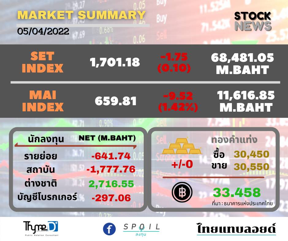 ตลาดหลักทรัพย์ ปิดวันนี้ที่ระดับ 1,701.18 จุด ลดลง 1.75 จุด (-0.10%) มูลค่าการซื้อขาย 68,481.05 ล้านบาท