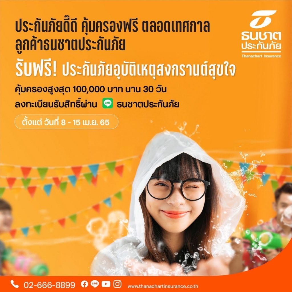 นี้ เพื่อให้ลูกค้าเดินทางกลับบ้านและท่องเที่ยวได้อย่างมีความสุข ขอมอบกรมธรรม์ประกันภัยอุบัติเหตุสงกรานต์สุขใจ ที่ให้ความคุ้มครองอุบัติเหตุวงเงินสูงสุด 100,000 บาท เพียงลงทะเบียนรับสิทธิผ่าน Line Official Account “ธนชาตประกันภัย” ตั้งแต่วันที่ 8 – 15 เมษายน 2565 โดยจะได้รับความคุ้มครองในวันถัดไปหลังมีข้อความยืนยันจากบริษัท และกรมธรรม์นี้มีระยะเวลาความคุ้มครองนานถึง 30 วัน