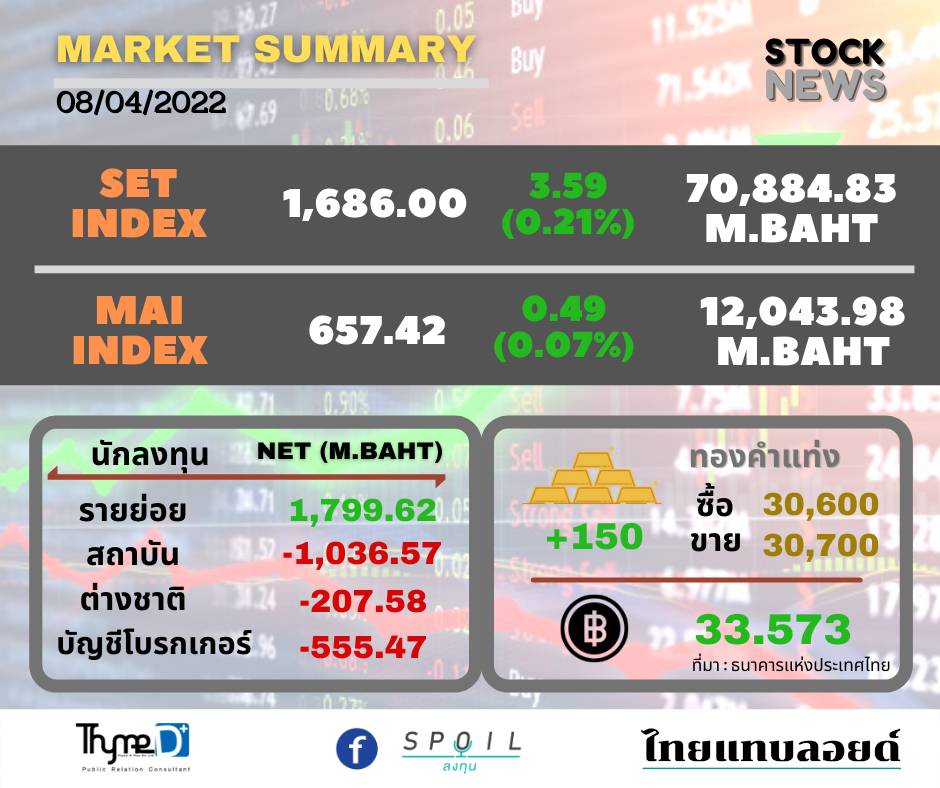 ตลาดหลักทรัพย์ ปิดวันนี้ที่ระดับ 1,686.00 จุด เพิ่มขึ้น 3.59 จุด (+3.59%) มูลค่าการซื้อขาย 70,884.83 ล้านบาท