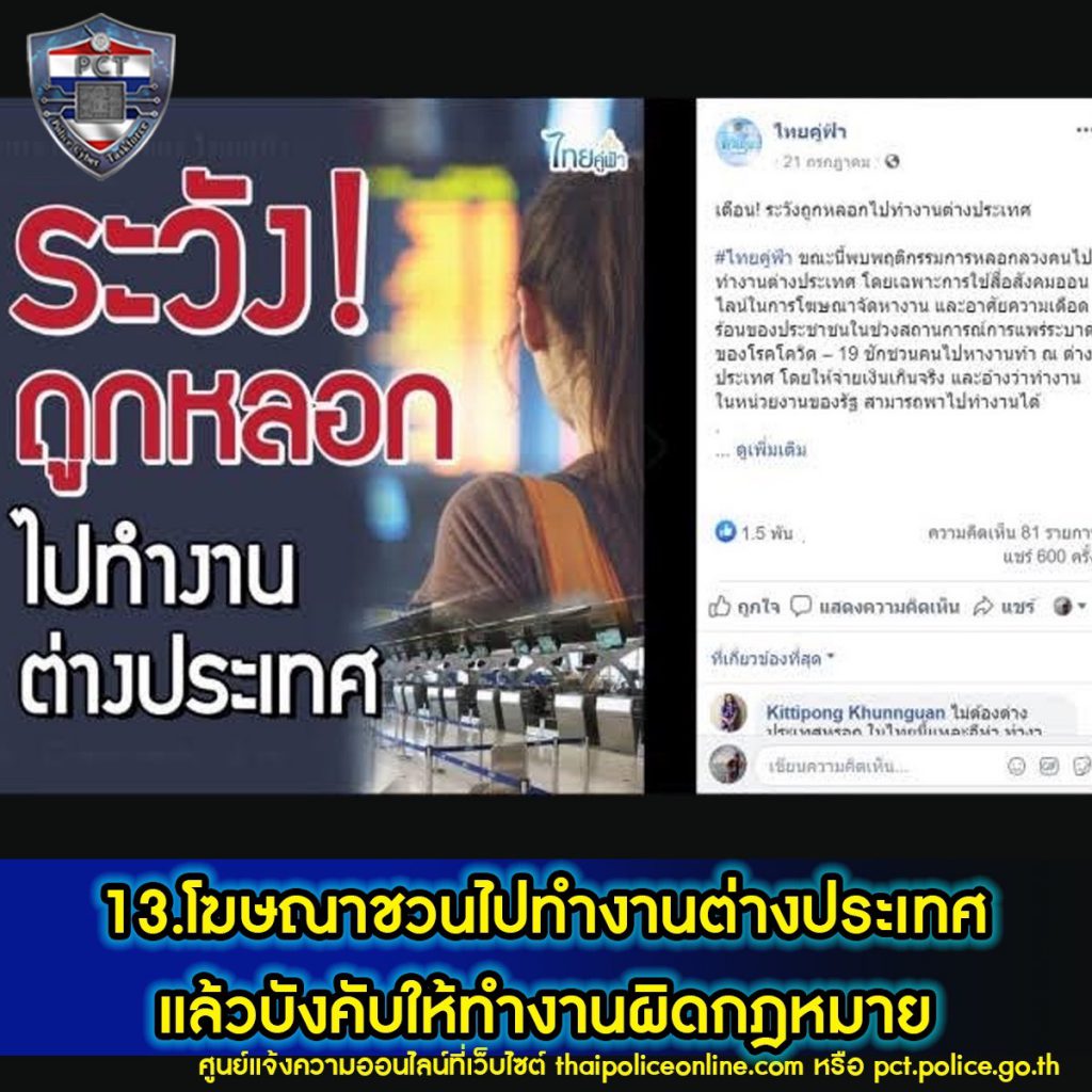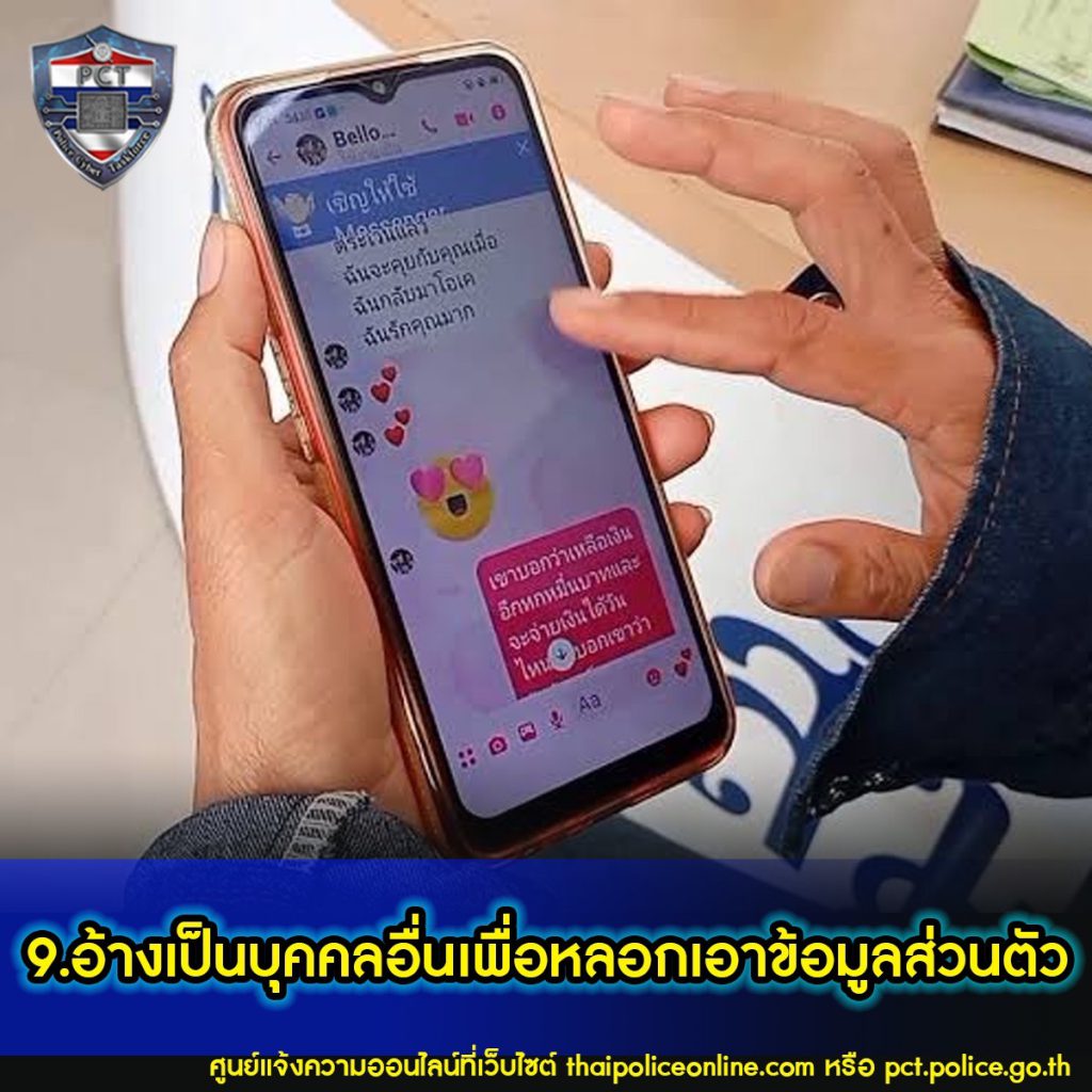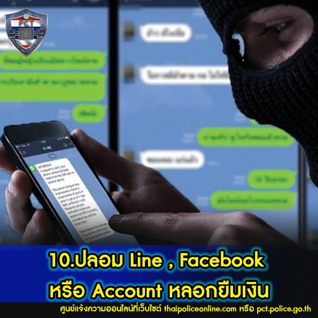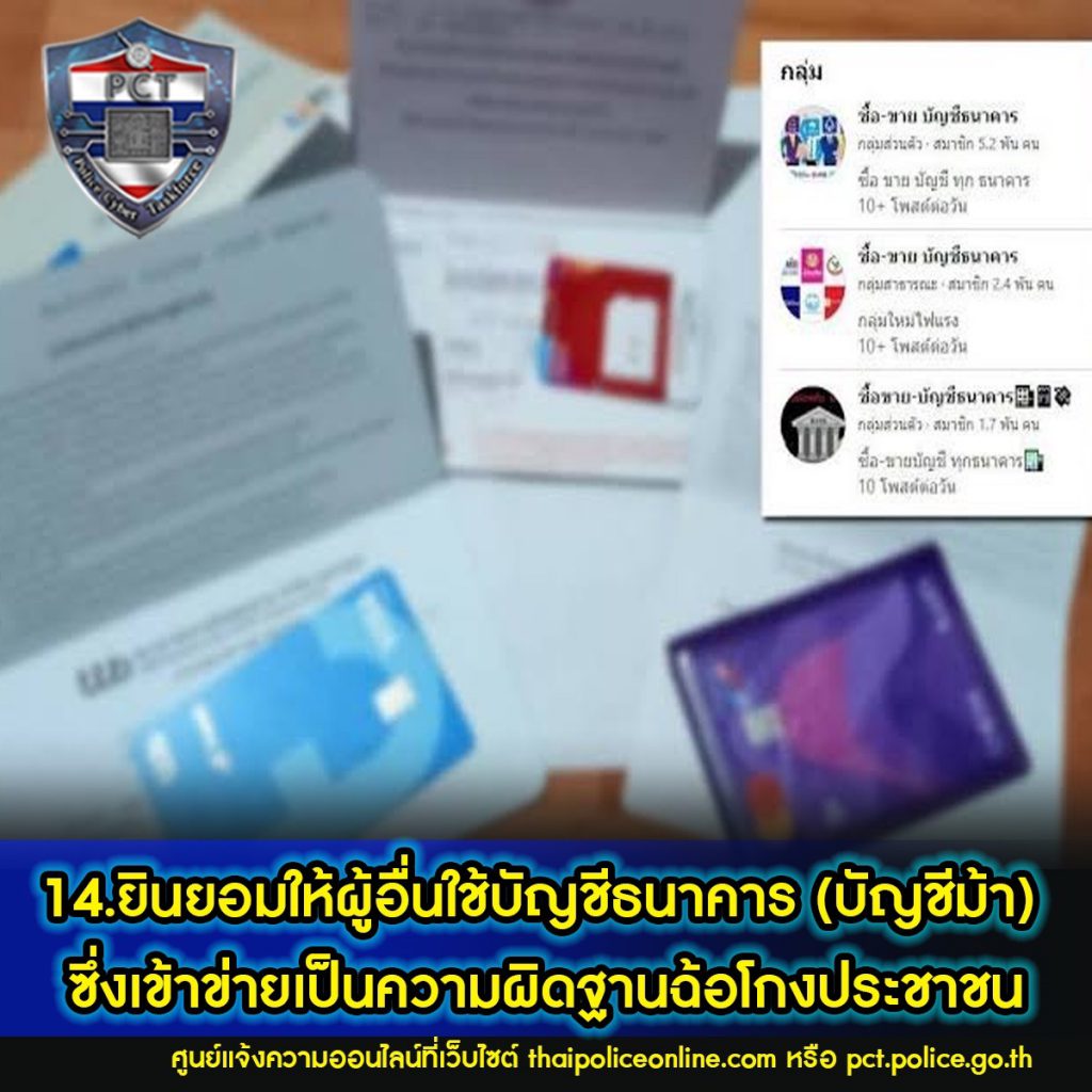 (8) ส่งลิงค์ปลอมเพื่อหลอกแฮ็กเอาข้อมูลส่วนตัว, (9) อ้างเป็นบุคคลอื่นเพื่อหลอกเอาข้อมูลส่วนตัว, (10) ปลอม Line, Facebook หรือ Account หลอกยืมเงิน, (11) ข่าวปลอม (Fake news) – ชัวร์ก่อนแชร์, (12) หลอกลวงเอาภาพโป้เปลือยเพื่อใช้แบล็คเมล์, (13) โฆษณาชวนไปทำงานต่างประเทศแล้วบังคับให้ทำงานผิดกฎหมาย, (14) ยินยอมให้ผู้อื่นใช้บัญชีธนาคาร (บัญชีม้า) ซึ่งเข้าข่ายเป็นความผิดฐานฉ้อโกงประชาชน