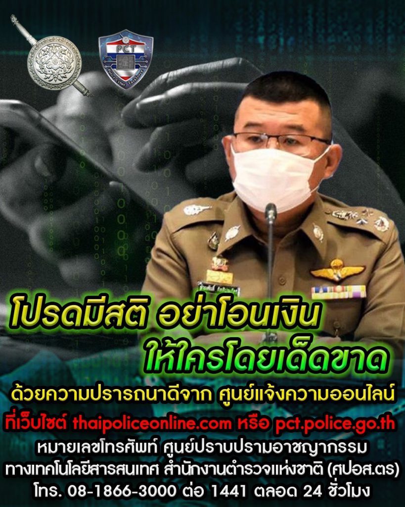พล.ต.อ.ดำรงศักดิ์ กล่าวอีกว่า พล.ต.อ.สุวัฒน์ แจ้งยอดสุข ผู้บัญชาการตำรวจแห่งชาติ (ผบ.ตร.) ได้สั่งการให้ทุกหน่วยเร่งระดมกวาดล้างอาชญากรรมทางเทคโนโลยีอย่างเข้มงวด สำหรับประชาชนหากพบเบาะแส หรือเกรงจะตกเป็นเหยื่อ สามารถแจ้งเข้ามาได้ที่ศูนย์แจ้งความออนไลน์ ที่เว็บไซต์ thaipoliceonline.com หรือ pct.police.go.th หมายเลขโทรศัพท์ 1441 ศูนย์ปราบปรามอาชญากรรมทางเทคโนโลยีสารสนเทศ สำนักงานตำรวจแห่งชาติ (ศปอส.ตร) โทร. 08-1866-3000 ตลอด 24 ชั่วโมง