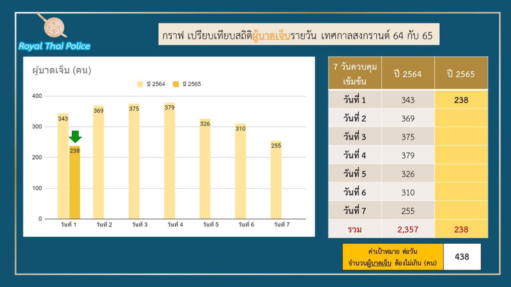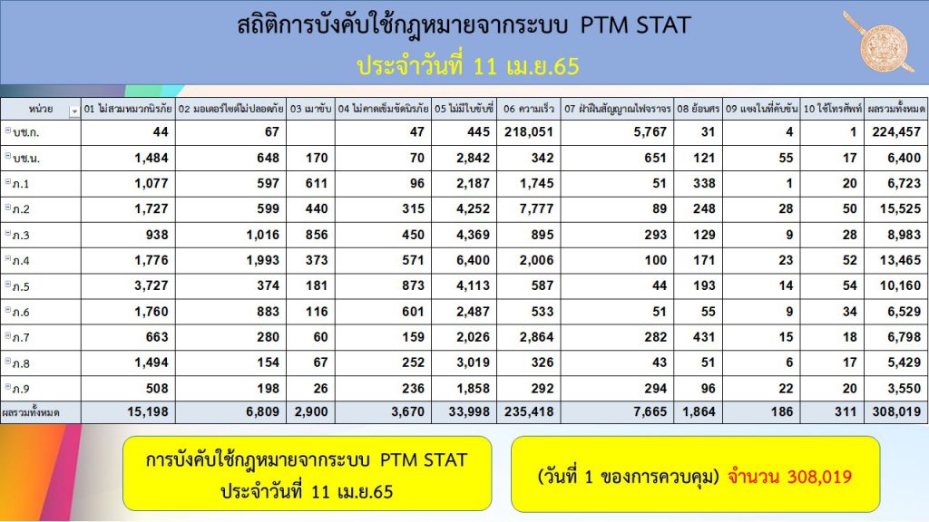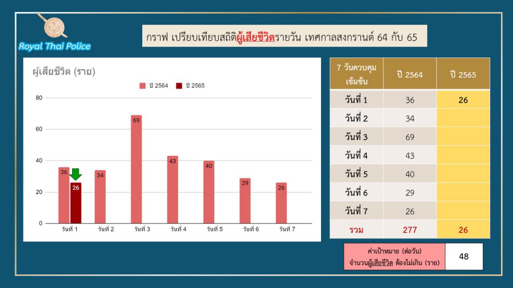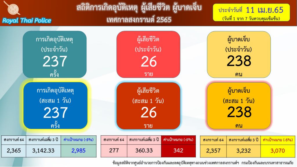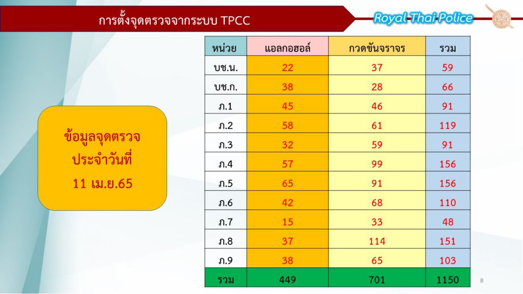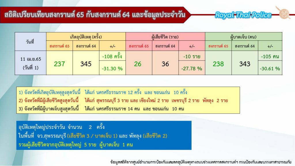 วันที่ 13 เมษายน 2565 เวลา 10.30 น. ที่ ศปก.ตร. ชั้น 19 อาคาร 1 สำนักงานตำรวจแห่งชาติ(ตร.) พล.ต.อ.ดำรงศักดิ์ กิตติประภัสส์ รอง ผบ.ตร.(มค.,กศ.) ได้ประชุมสั่งการผ่านระบบวีดีโอคอนเฟิร์นเร้นส์ถึงมาตรการปฏิบัติในช่วงเทศกาลสงกรานต์ 2565 ถึงหน่วยปฎิบัติทุกหน่วยในสังกัดตำรวจแห่งชาติ ว่า 1.) ขอชมเชยการปฏิบัติงานของทุกหน่วยในการป้องกันและลดอุบัติเหตุ ห้วงสองวันแรกของช่วง “7 วันควบคุมเข้มข้น” เทศกาลสงกรานต์ 2565 สถิติการเกิดอุบัติเหตุ ผู้เสียชีวิต ผู้บาดเจ็บ ในภาพรวมลดลงทุกตัวเลข เมื่อเทียบกับช่วงเดียวกันของสงกรานต์ปี 2564 และค่าเฉลี่ยย้อนหลัง 3 ปี แต่จำนวนผู้เสียชีวิตเมื่อเทียบกับสงกรานต์ 2564 ยังสูงอยู่ ขอให้ทุกหน่วยคงดำรงการปฏิบัติให้เข้มแข็งอย่างต่อเนื่องจนจบเทศกาล เพื่อจะได้ลดสถิติอุบัติเหตุได้ตามค่าเป้าหมายตามที่รัฐบาลกำหนด, 2.) ให้บังคับใช้กฎหมาย 10 ข้อหาหลักอย่างเข้มข้น โดยเฉพาะ ข้อหาขับรถในขณะเมาสุรา ,ขับรถเร็วเกินกำหนด,ไม่สวมหมวกนิรภัย อย่างต่อเนื่องจนถึง 17 เม.ย.65 การตั้งจุดตรวจต้องเป็นไป ตามมาตรฐาน SOP ที่ ตร. กำหนด รวมถึงต้องปฏิบัติตามมาตรฐานขั้นตอนการป้องกันการแพร่ระบาดของโรคโควิด – 19 ทั้งนี้ ในการปฏิบัติหน้าที่ให้ใช้กริยาวาจาที่สุภาพ อธิบายให้ประชาชนเข้าใจถึงความสำคัญและความจำเป็นในการกวดขันจับกุมการทำผิดกฎจราจร และขอให้เจ้าหน้าที่ตำรวจทุกนายมีความอดทนอดกลั้นในการปฏิบัติหน้าที่