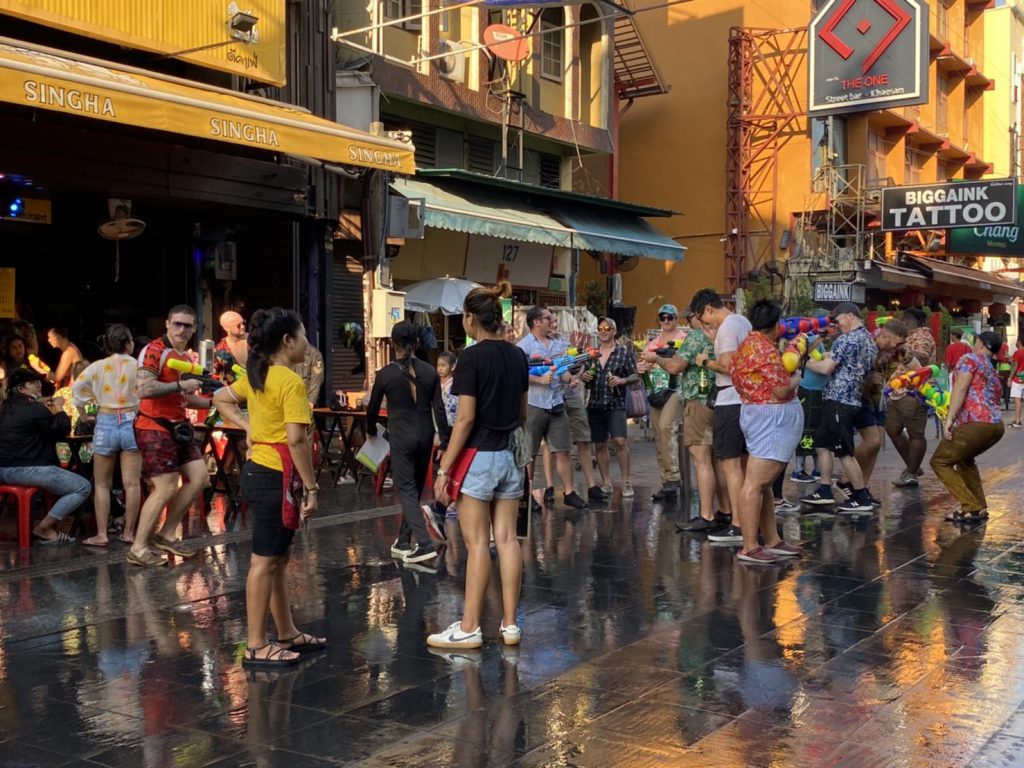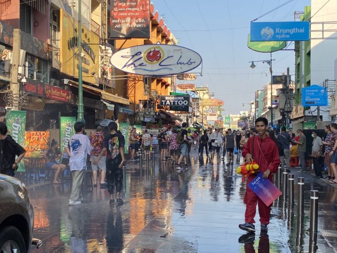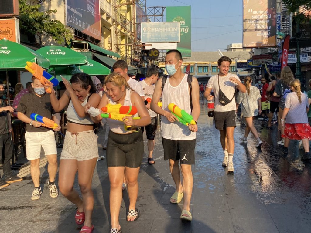 วันที่ 13 เมษายน 2565 ที่ถนนข้าวสาร ผู้สื่อข่าว ไทยแทบลอยด์ รายงาน บรรยากาศตั้งแต่ช่วงเย็นที่ผ่านมา เริ่มมีนักท่องเที่ยวทั้งชาวไทยและต่างชาติ เดินทางเข้ามาร่วมเล่นน้ำสงกรานต์กันอย่างคึกคัก ตามร้านอาหาร 2 ข้างทาง ถือปืนฉีดน้ำเข้ามาฉีดใส่กันอย่างสนุกสนาน บ้างคนก็เต้นตามจังหวะเพลง ที่ดังกึกก้อง ที่แต่ละร้านมาเปิดสร้างบรรยากาศให้ครึกครื้น แม้มาตรการของภาครัฐจะสั่งห้ามเล่นน้ำในช่วงสงกรานต์ เพื่อป้องกันการแพร่ระบาดของเชื้อโควิด 19