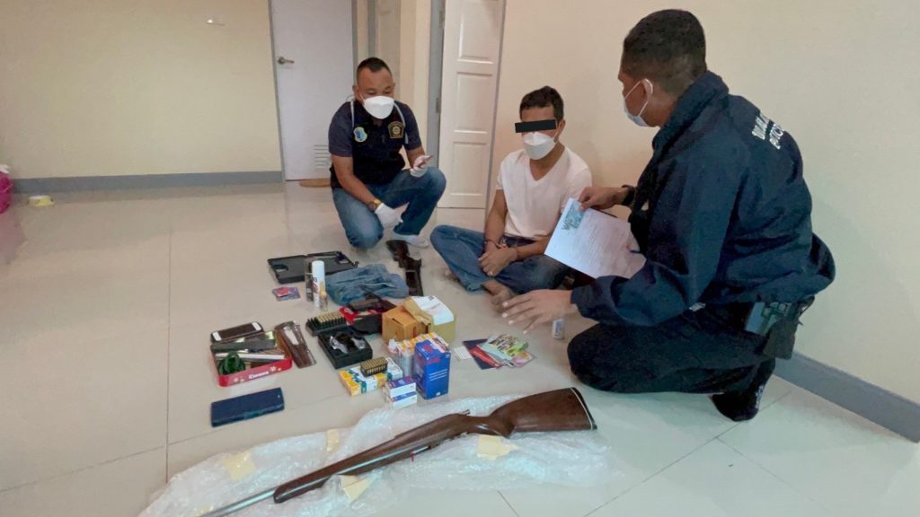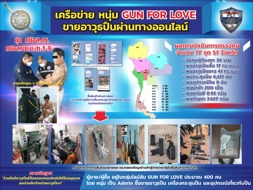 พล.ต.อ.ดำรงศักดิ์ เปิดเผยว่า ปฏิบัติการครั้งนี้สืบเนื่องจาก พล.ต.อ.สุวัฒน์ แจ้งยอดสุข ผู้บัญชาการตำรวจแห่งชาติ (ผบ.ตร.) สั่งการให้ศูนย์ PCT และ บช.น.,ภ.1-9 ระดมกวาดล้างอาชญากรรมทุกประเภท ในห้วงเทศกาลสงกรานต์ ตามนโยบายรัฐบาล โดยเฉพาะอาชญากรรมทางออนไลน์ ที่สร้างความเดือดร้อนให้กับประชาชนอย่างมากในขณะนี้ สำหรับคดีนี้ ชุดปฏิบัติการ PCT ร่วมกับ บก.สส.ภ.8 สืบสวนทราบว่า มีการซื้อขายอาวุธปืนผ่านกลุ่มไลน์ชื่อว่า “GUN FOR LOVE” มีสมาชิก 400 กว่าคน โดยแอดมินใช้ชื่อ “หนุ่ม” เป็นพ่อค้าคนกลาง สั่งสินค้ามาขายต่อให้เพื่อนสมาชิก โดยมีการรีวิวสินค้า เป็นอาวุธปืน ลำกล้อง เครื่องกระสุน ชนิดต่างๆ มีทั้งของที่ได้รับอนุญาตและไม่ได้รับอนุญาตจากนายทะเบียน หากสมาชิกสนใจ จะต้องโอนเงินผ่านบัญชื่อ “โสภาวดี เวฬุการ” และแอดมินจะสั่งให้คนขายส่งสินค้าไปให้สมาชิกโดยตรงทางไปรษณีย์ จากการตรวจสอบพบว่ามีการส่งสินค้าแล้วทั่วประเทศ หวั่นนำไปก่อเหตุในห้วงเทศกาลสงกรานต์
