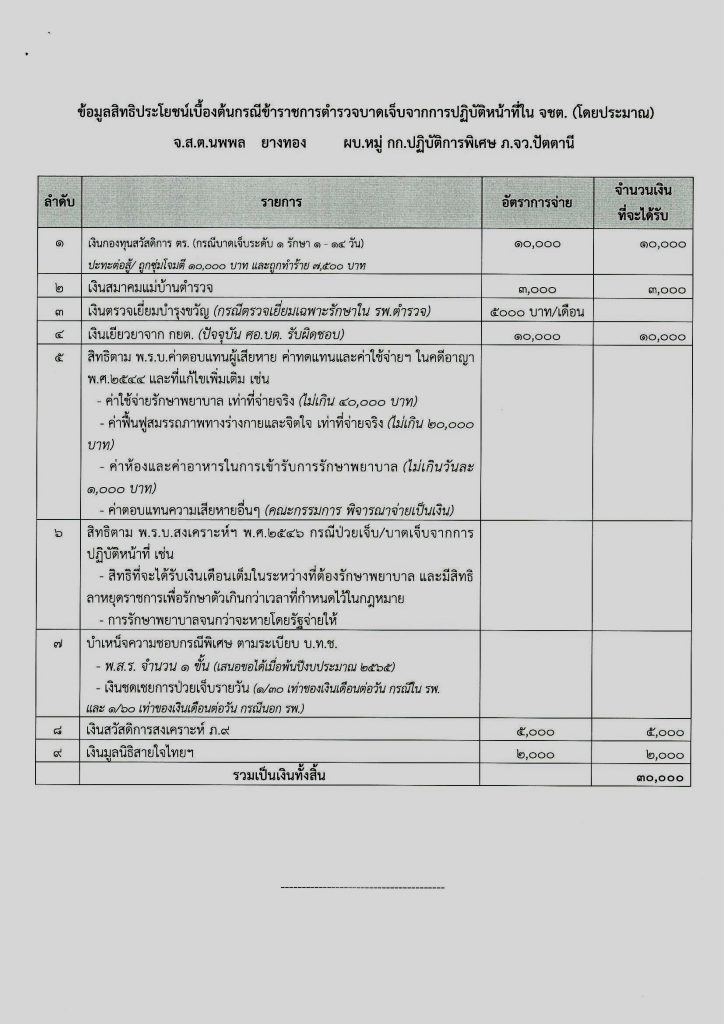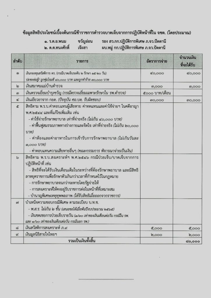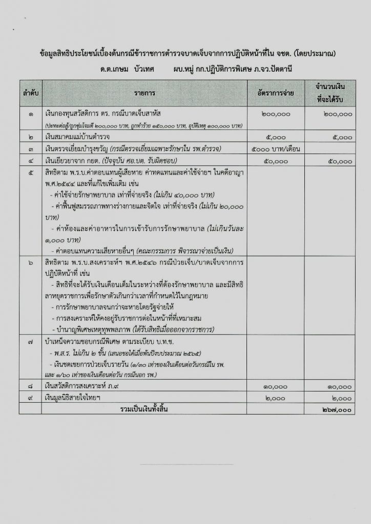 พล.ต.ต.ยิ่งยศ เปิดเผยอีกว่า สำหรับเงินสวัสดิการเบื้องต้น ของ ร.ต.อ.พนม ขวัญอ่อน ชุดเก็บกู้วัตถุระเบิด รอง สว.กก.ปพ.ภ.จว.ปัตตานี ได้รับ 80,000 บาท, ด.ต.ทนงศักดิ์ เจ๊ะสา ชุดเก็บกู้วัตถุระเบิด ผบ.หมู่กก.ปพ.ภ.จว.ปัตตานี ได้รับ 80,000 บาท, จ.ส.ต.นพพล ยางทอง ผบ.หมู่ กก.ปพ.ภ.จว.ปัตตานี ได้รับ 30,000 บาท และ ด.ต. เกษม บัวเทศ ชุดเก็บกู้วัตถุระเบิด ผบ.หมู่ กก.ปพ.ภ.จว.ปัตตานี ซึ่งได้รับบาดเจ็บอาการค่อนข้างหนักได้รับเงินสวัสดิการในเบื้องต้น 267,000 บาท