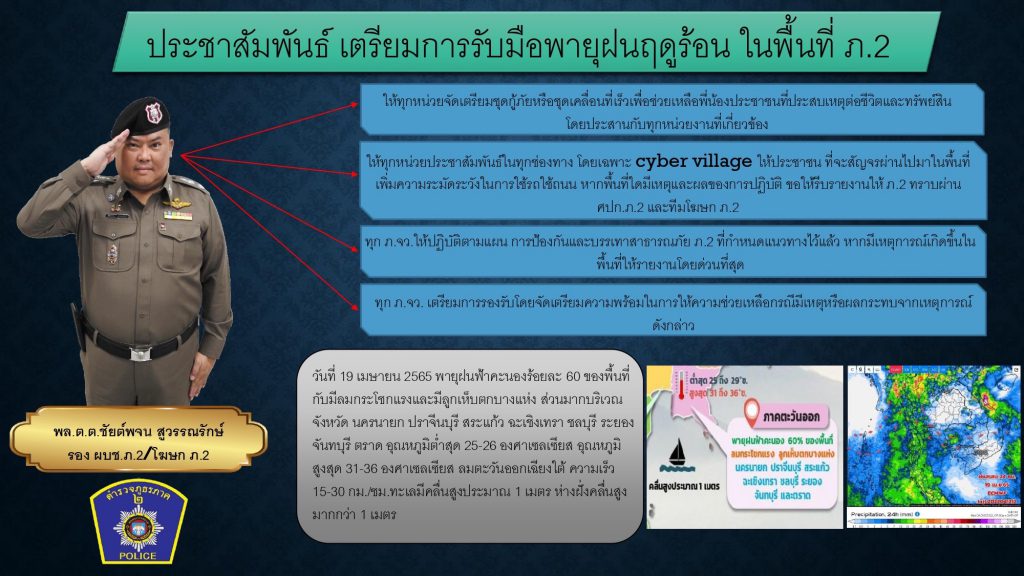 โดยจังหวัดในพื้นที่ ภ.2 จะมีพายุฝนฟ้าคะนองร้อยละ 60 ของพื้นที่ มีลมกระโชกแรงและมีลูกเห็บตกบางแห่ง ส่วนมากบริเวณจังหวัดนครนายก ปราจีนบุรี สระแก้ว ฉะเชิงเทรา ชลบุรี ระยอง จันทบุรี และตราด อุณหภูมิต่ำสุด 25-26 องศาเซลเซียส อุณหภูมิสูงสุด 31-36 องศาเซลเซียส ลมตะวันออกเฉียงใต้ ความเร็ว 15-30 กม./ชม. ทะเลมีคลื่นสูงประมาณ 1 เมตร ห่างฝั่งคลื่นสูงมากกว่า 1 เมตร พล.ต.ท.ธิติ แสงสว่าง ผู้บัญชาการตำรวจภูธรภาค 2 (ผบช.ภ.2) ได้มีข้อสั่งการให้ตนในฐานะโฆษก ภ.2 เตรียมการรับมือกับพายุฝนฤดูร้อน ในวันที่ 19 เมษายน พ.ศ.2565 โดยให้ทุกหน่วยจัดเตรียมชุดกู้ภัยหรือชุดเคลื่อนที่เร็วเพื่อช่วยเหลือพี่น้องประชาชนที่ประสพเหตุต่อชีวิตและทรัพย์สิน โดยประสานกับทุกหน่วยงานที่เกี่ยวข้อง, ให้ทุกหน่วยประชาสัมพันธ์ในทุกช่องทาง โดยเฉพาะ cyber village ให้ประชาชน ที่จะสัญจรผ่านไปมาในพื้นที่เพิ่มความระมัดระวังในการใช้รถใช้ถนน หากพื้นที่ใดมีเหตุและผลของการปฏิบัติ ขอให้รีบรายงานให้ ภ.2 ทราบผ่าน ศปก.ภ.2 และทีมโฆษก ภ.2, ทุก ภ.จว.ให้ปฎิบัติตามแผน การป้องกันและบรรเทาสาธารณภัย ภ.2 ที่กำหนดแนวทางไว้แล้ว หากมีเหตุการณ์เกิดขึ้นในพื้นที่ให้รายงานโดยด่วนที่สุด และให้ทุก ภ.จว. เตรียมการรองรับโดยจัดเตรียมความพร้อมในการให้ความช่วยเหลือกรณีมีเหตุหรือผลกระทบจากเหตุการณ์ดังกล่าว