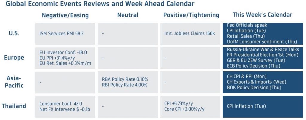ในสัปดาห์นี้ เรามองว่า นอกเหนือจากสถานการณ์สงครามรัสเซีย-ยูเครน ตลาดจะจับตาผลการเลือกตั้งประธานาธิบดีฝรั่งเศสรอบแรก และผลการประชุมของธนาคารกลางยุโรป (ECB)