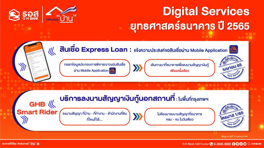 ด้านการปรับกระบวนการให้บริการลูกค้าด้วย Digital Services ตามแผนยุทธศาสตร์ของธนาคารในปี 2565 ล่าสุด ธอส. เตรียมเปิดให้ลูกค้าแจ้งความประสงค์ขอยื่นกู้จากที่ไหนก็ได้ผ่าน Mobile Application : GHB ALL (ปัจจุบันอยู่ระหว่างการพัฒนาเป็น Mobile Application : GHB ALL GEN)ด้วยเมนู “สินเชื่อ Express Loan” เพียงกรอกข้อมูลที่ธนาคารใช้ประกอบการพิจารณาวงเงินสินเชื่อไม่กี่ขั้นตอน และเดินทางมาที่ธนาคารเพื่อลงนามสัญญาเงินกู้เพียงครั้งเดียว โดยจะเริ่มให้บริการลูกค้าอย่างเป็นทางการภายในเดือนเมษายน 2565 นอกจากนี้ในช่วงไตรมาส 1 ของปี 2565 ลูกค้าในพื้นที่กรุงเทพฯ สามารถเลือกลงนามสัญญาเงินกู้นอกสถานที่ทำการของธนาคารด้วยโครงการใหม่ คือ “GHB Smart Rider” การลงนามสัญญาเงินกู้ที่บ้าน ที่ทำงาน ร้านอาหาร ร้านกาแฟ หรือที่สำนักงานที่ดินโดยไม่ต้องเดินทางมาที่ธนาคาร ขณะที่ภายในไตรมาสที่ 2 ของปี 2565 ลูกค้ากลุ่มสวัสดิการที่ทำนิติกรรม ณ สำนักงานที่ดิน และจดทะเบียนจำนองกับธนาคารเรียบร้อยแล้ว สามารถนำโฉนดที่ดินตัวจริงกลับบ้านได้ทันที จากเดิมที่ลูกค้าจะได้รับเป็นสำเนาโฉนดที่ดินจนกว่าจะปิดบัญชีเงินกู้แล้วเท่านั้น