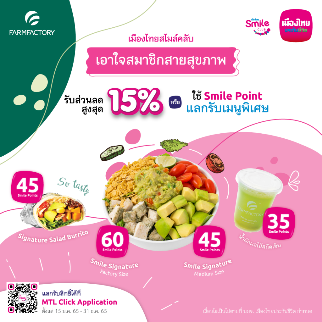 ด้าน Farmfactory มื้อสลัดสุขภาพคุณภาพดีที่ทางร้านจัดเต็มเมนูสลัดผักพร้อมวัตถุดิบเครื่องเคียงที่ส่งตรงจากฟาร์มและน้ำสลัดสูตรเฉพาะที่ทางร้านรังสรรค์มาเพื่อให้ถูกปากรสชาติคนไทย อีกทั้งยังมีเมนูน้ำผักผลไม้สกัดเย็นเครื่องดื่มสุขภาพที่ดีต่อร่างกาย ให้สมาชิกฯ สามารถเข้าถึงการดูแลสุขภาพแบบๆ ง่าย โดยใช้คะแนนสะสมเริ่มต้นที่ 35 Smile Points แลกรับน้ำผักผลไม้สกัดเย็น และพิเศษ! รับส่วนลดสูงสุด 15% เมื่อซื้อเมนูสลัดและเครื่องดื่ม ครบ 1,000 บาท (สามารถรับสิทธิ์ได้ที่หน้าร้านเท่านั้น) สมาชิกเมืองไทยสไมล์คลับสามารถแลกคะแนนสะสม Smile Point ผ่านทางแอปพลิเคชัน MTL Click หรือโทร. 1766 โดยสามารถแลกรับสิทธิ์ได้ตั้งแต่วันนี้ ถึงวันที่ 31 ธันวาคม 2565