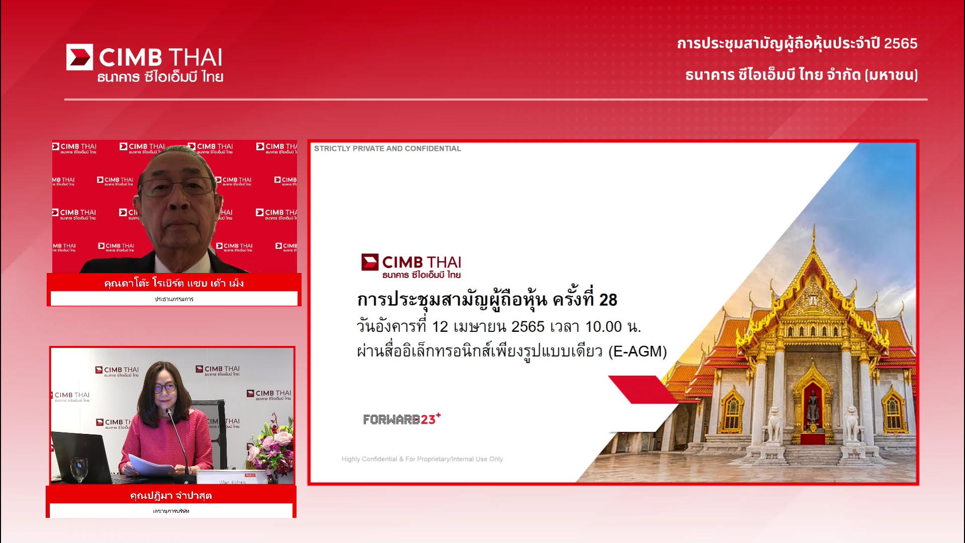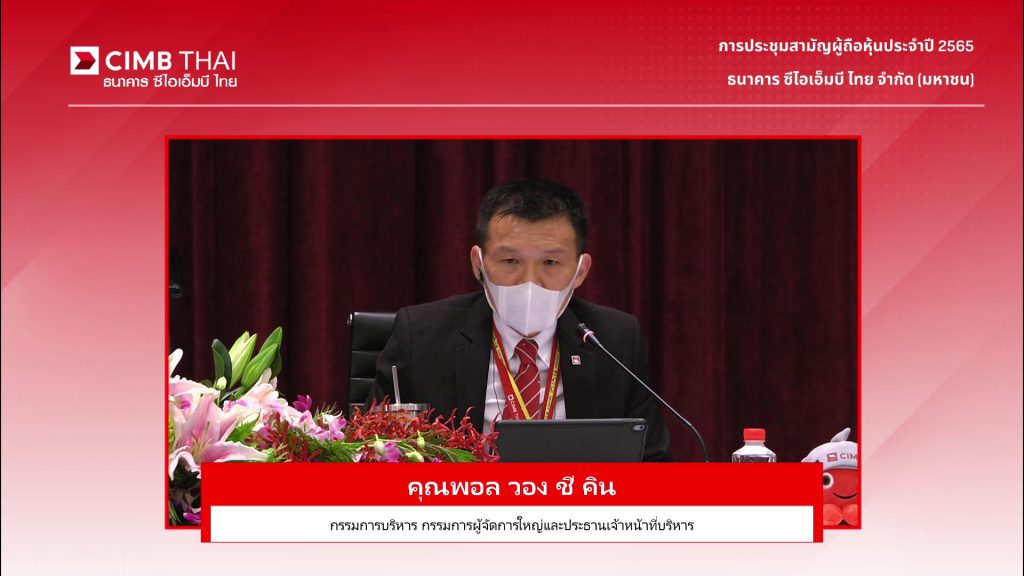 ธนาคาร ซีไอเอ็มบี ไทย จัดการประชุมสามัญผู้ถือหุ้น ครั้งที่ 28 เมื่อวันที่ 12 เม.ย. 65 โดยถ่ายทอดสดการประชุมผ่านสื่ออิเล็กทรอนิกส์ จากห้อง