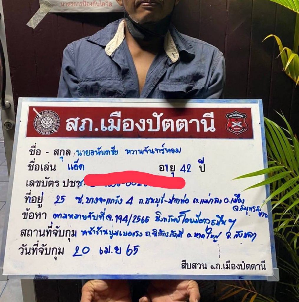 ทางเจ้าหน้าที่จึงได้ทำการตรวจสอบว่า ในช่วงเวลาดังกล่าว ใครเป็นคนกดเงินที่ตู้เอทีเอ็ม ทำให้สามารถทราบชื่อ จากนั้นจึงทำการตรวจสอบหมายเลขโทรศัพท์ จึงทำให้ทราบว่าได้เข้ามาหลบซ่อนตัวที่ อ.สะเดา จ.สงขลา ทางเจ้าหน้าที่จึงได้ขอศาลออกหมายจับ ที่ จ.194/2565 เพื่อทำการจับกุมตัว