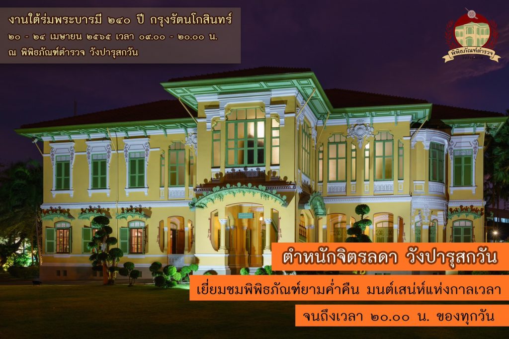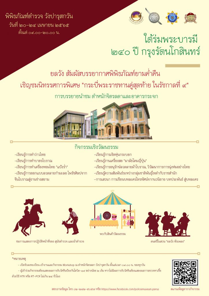 พิพิธภัณฑ์ตำรวจ สำนักงานตำรวจแห่งชาติ ขอเชิญชวนพี่น้องประชาชนเข้าร่วมงานใต้ร่มพระบารมี 240 ปี กรุงรัตนโกสินทร์ และเยี่ยมชมพิพิธภัณฑ์ตำรวจวังปารุสกวัน ภายใต้กิจกรรม“ยลวัง สัมผัสบรรยากาศพิพิธภัณฑ์ยามค่ำคืน” และร่วมรับชมนิทรรศการพิเศษ “กระบี่พระราชทานคู่สุดท้าย ในรัชกาลที่ ๙”