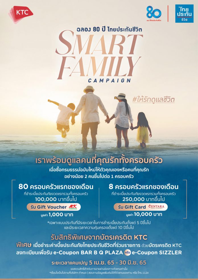 แคมเปญ “ฉลอง 80 ปี ไทยประกันชีวิต Smart Family” เป็นแคมเปญที่ดูแลคุณและคนที่คุณรักทั้งครอบครัว โดยมอบสิทธิพิเศษ 2 ต่อ เมื่อซื้อกรมธรรม์ไทยประกันชีวิตฉบับใหม่ให้ตัวคุณเองหรือคนที่คุณรักตั้งแต่ 2 คนขึ้นไปต่อ 1 ครอบครัว ผ่านช่องทางตัวแทนฯ ต่อแรก รับฟรีบัตรกำนัล MK Restaurant มูลค่า 1,000 บาท ต่อ 1 ครอบครัว สำหรับยอดชำระเบี้ยประกันปีแรกรวมทุกกรมธรรม์ตั้งแต่ 100,000 บาทขึ้นไป (จำกัด 80 สิทธิ์ต่อเดือน รวม 720 สิทธิ์ตลอดแคมเปญ) และรับฟรีบัตรกำนัลจากโรงแรมเซ็นทารา มูลค่า 10,000 บาท ต่อ 1 ครอบครัว สำหรับยอดชำระเบี้ยประกันปีแรกรวมทุกกรมธรรม์ตั้งแต่ 250,000 บาทขึ้นไป (จำกัดจำนวน 8 สิทธิ์ต่อเดือน รวม 72 สิทธิ์ตลอดแคมเปญ) ตั้งแต่วันนี้ – 31 ธันวาคม 2565