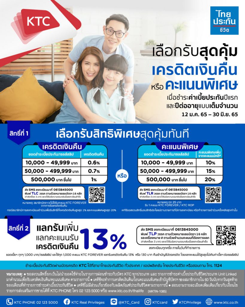 และแคมเปญ “เลือกรับเครดิตเงินคืน หรือคะแนนพิเศษ” มอบสิทธิพิเศษสำหรับลูกค้าที่ชำระเบี้ยประกันภัย ทั้งเบี้ยประกันภัยปีแรก และ/หรือเบี้ยประกันภัยปีต่ออายุของไทยประกันชีวิต ผ่านบัตรเครดิตเคทีซี รับสิทธิพิเศษ 2 ต่อ ต่อแรกเลือกรับเครดิตเงินคืน หรือคะแนนพิเศษ โดยไม่จำกัดยอดรับสูงสุดตลอดรายการ ต่อที่สอง สามารถใช้คะแนน KTC FOREVER ทุก 1,000 คะแนน แลกรับเครดิตเงินคืน 13% หรือ 130 บาท ลงทะเบียนตามเงื่อนไขเพื่อรับสิทธิ์ ตั้งแต่วันนี้ – 30 มิถุนายน 2565