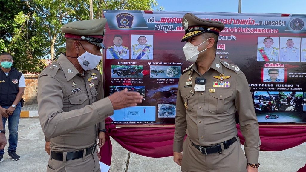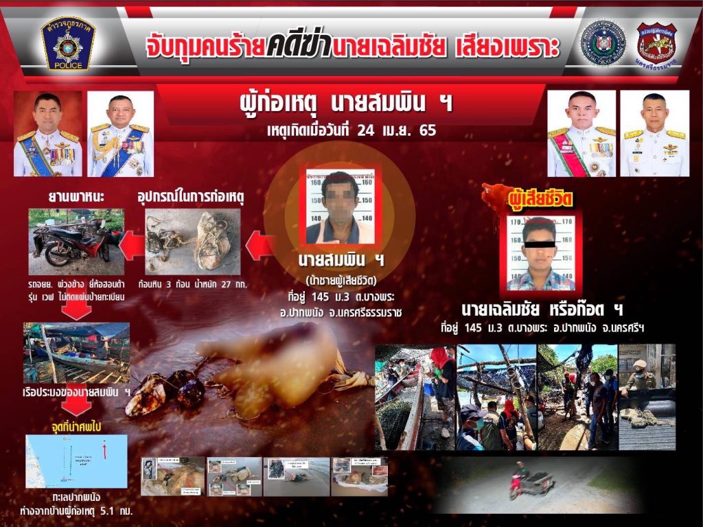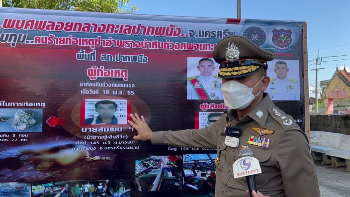 วันที่ 28 เมษายน 2565 พล.ต.ท.สุรเชษฐ์ หักพาล ผู้ช่วย ผบ.ตร. เปิดเผยว่า จากกรณีเมื่อวันที่ 24 เม.ย. 2565 เวลา 17.30 น. ร.ต.อ.ประภาส สมศรี พนักงานสอบสวน สภ.ปากพนัง รับแจ้งเหตุพบศพลอยน้ำอยู่กลางทะเล ห่างจากชายฝั่ง 2 กม. จึงได้ให้มูลนิธิลากศพเข้าฝั่ง ที่ชายหาดหมู่ 1 ต.บางพระ อ.ปากพนัง จ.นครศรีธรรมราช ทั้งนี้จากการชันสูตรพลิกศพ พบว่า ผู้ตายเสียชีวิตมาประมาณ 7 – 10 วัน โดยสภาพศพถูกมัด และถ่วงด้วยก้อนหิน จำนวน 3 ก้อน เจ้าหน้าที่จึงได้ดำเนินการรวบรวมพยานหลักฐานเพื่อดำเนินการสอบสวน เนื่องจากเป็นคดีอุกฉกรรจ์ สะเทือนขวัญ และเป็นที่สนใจของประชาชน สื่อมวลชน
