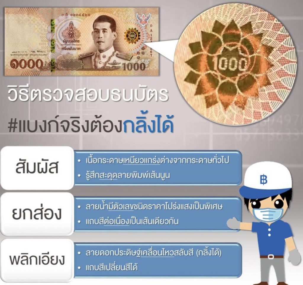 สำนักงานตำรวจแห่งชาติ จะประสานข้อมูลจาก ธนาคารแห่งประเทศไทย อีกช่องหนึ่ง เพื่อแนะนำให้พี่น้องประชาชนได้ระมัดระวังในการเฝ้าระวังเพื่อป้องกันมิให้ตกเป็นเหยื่อจากการใช้ธนบัตรปลอมที่กำลังเริ่มระบาดอยู่ในพื้นที่ต่าง ๆ ในขณะนี้ สำหรับวิธีสังเกตในเบื้องต้นธนบัตรใบละ 1,000 บาท ที่ดูได้แบบง่าย ๆ เร็ว ๆ ว่าปลอมหรือไม่ ให้ดูที่ “แถบสีในเนื้อกระดาษ” ดังนี้ เป็นพลาสติกสีทองที่ฝังไว้ในเนื้อกระดาษตามแนวตั้งของธนบัตร จึงเรียกว่า “แถบสีทอง”, ในมุมปกติจะมองเห็นเป็นเส้นประแต่เมื่อส่องกับแสงจะเห็นเป็นเส้นตรงและมีข้อความ “1000 บาท 1000BAHT”, เมื่อพลิกเปลี่ยนมุมมองจะเปลี่ยนจากสีทองเป็นสีเขียวและลวดลายในแถบจะกลิ้งเคลื่อนไหวไปมาได้, แถบสีอาจมีรอยขูดขีด หลุดลอกชำรุดจากการใช้งานได้, และแถบสีที่อยู่ในเนื้อกระดาษธนบัตรแต่ละฉบับสามารถอยู่ในตำแหน่งที่ไม่ตรงกันได้ โดยอาจเลื่อนไปทางซ้ายหรือขวา ตามระยะที่มาตรฐานกำหนดไว้