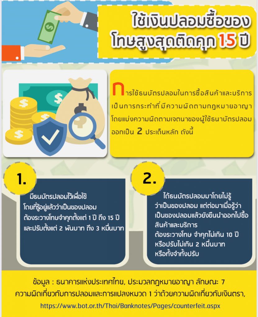 สำหรับการใช้ธนบัตรปลอมในการซื้อสินค้าและบริการเป็นการกระทำที่มีความผิดตามกฎหมายอาญาโดยแบ่งความผิดตามเจตนาของผู้ใช้ธนบัตรปลอมออกเป็น 2 ประเด็นหลัก ดังนี้ เช่นได้ธนบัตรปลอมมาโดยไม่รู้ว่าเป็นของปลอม แต่ต่อมาเมื่อรู้ว่าเป็นของปลอมแล้วยังขืนนำออกไปซื้อสินค้าและบริการต้องระวางโทษ จำคุกไม่เกิน 10 ปีหรือปรับไม่เกิน 20,000 บาท หรือทั้งจำทั้งปรับ และการมีธนบัตรปลอมไว้เพื่อใช้โดยที่รู้อยู่แล้วว่าเป็นของปลอมต้องระวางโทษจำคุกตั้งแต่ 1 ปี ถึง 15 ปี และปรับตั้งแต่ 2,000 บาท ถึง 30,000 บาท “โฆษก ตร. กล่าวเตือน”