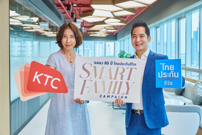 นายนิติพงษ์ ปรัชญานิมิต ผู้ช่วยผู้จัดการใหญ่ และ Chief Marketing Officer บริษัท ไทยประกันชีวิต จำกัด (มหาชน) ร่วมกับ นางพิทยา วรปัญญาสกุล รองประธานเจ้าหน้าที่บริหาร – การตลาดบัตรเครดิต “เคทีซี” หรือ บริษัท บัตรกรุงไทย จำกัด (มหาชน) จัดแคมเปญ“ฉลอง 80 ปี ไทยประกันชีวิต Smart Family” พร้อมดูแลคนที่คุณรักทั้งครอบครัว มอบสิทธิพิเศษ 2 ต่อ เมื่อซื้อกรมธรรมฉบับใหม่ให้ตัวคุณเองหรือคนที่คุณรักตั้งแต่ 2 คนขึ้นไปต่อ 1 ครอบครัว ผ่านตัวแทนฯ ไทยประกันชีวิต