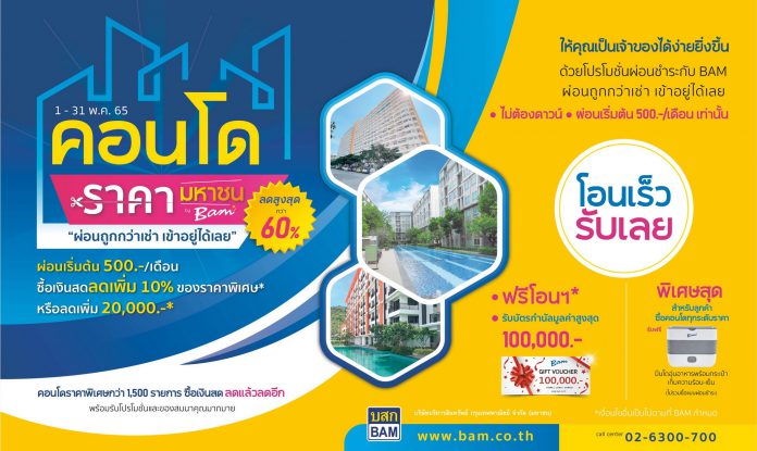 BAM จัดงานคอนโดราคามหาชน by BAM พร้อมโปรโมชั่นจัดเต็ม ระหว่างวันที่ 1 – 31 พฤษภาคม 2565 คัดคอนโดทำเลดีกว่า 1,500 รายการ ทั้งในกรุงเทพฯ ปริมณฑล และต่างจังหวัด ลดราคาสูงสุดกว่า 60% อัดโปรแรงสำหรับคอนโดราคาพิเศษ ลดแล้วลดอีก เมื่อซื้อเงินสด หรือ เลือกซื้อแบบผ่อนชำระกับ BAM คิดดอกเบี้ย 0% นาน 12 เดือน ไม่ต้องดาวน์ เริ่มต้น 500 – 2,500 บาท / เดือนเท่านั้น