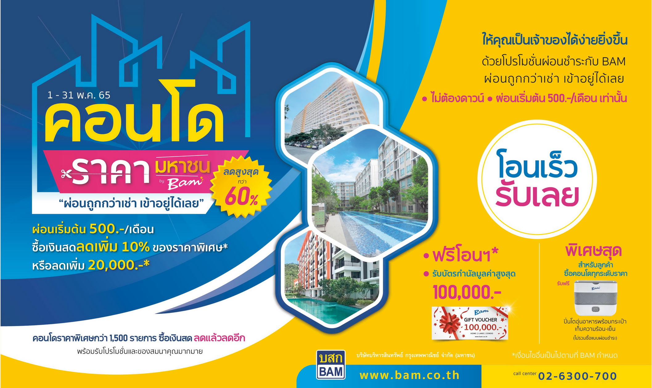 ในกรุงเทพฯ ปริมณฑล และต่างจังหวัด นำมาจัดโปรโมชั่นลดราคาสูงสุดกว่า 60% พร้อมอัดโปรแรง เมื่อลูกค้าซื้อเงินสดจะได้รับส่วนลดแบบลดแล้วลดอีก สำหรับคอนโดราคาพิเศษไม่เกิน 5 แสนบาท ลดเพิ่มอีก 10% คอนโดราคาพิเศษมากกว่า 5 แสนบาท ถึง 1 ล้านบาท ลดเพิ่มอีก 20,000 บาท ขณะที่ลูกค้าซื้อทรัพย์ BAM และโอนภายใน 30 วัน นับตั้งแต่วันที่อนุมัติขาย รับโปรโมชั่น “โอนเร็ว รับเลย” ฟรีค่าโอนสูงสุด 9 แสนบาท และบัตรกำนัลมูลค่าสูงสุด 1 แสนบาท พิเศษสุด! เมื่อซื้อคอนโดทุกระดับราคา รับทันที ของสมนาคุณ “ปิ่นโตอุ่นอาหารพร้อมกระเป๋าเก็บความร้อนความเย็น ”