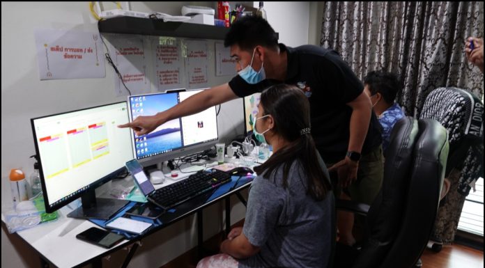 ต่อมาวันที่ 27 พ.ค. 65 เวลา 07.30 น. เจ้าหน้าที่ตำรวจนำหมายค้นศาลแขวงระยองที่ 29/2565 ลงวันที่ 26 พฤษภาคม 2565 เข้าตรวจค้นบ้านเลขที่ 111/103 ม.6 ต.ทับมา อ.เมืองระยอง จ.ระยอง เป็นบ้านลักษณะเป็นบ้านแฝด 3 ชั้น หน้าต่างปิดทึบทุกบ้าน พร้อมติดลูกกรงทุกบาน ผลการตรวจค้นพบว่า ชั้น 2 ของบ้านหลังดังกล่าวใช้เป็นออฟฟิศลับที่ตั้งของแอดมินที่ดูแลระบบเว็บไซต์ในการทำเว็บไซต์พนันออนไลน์ พบผู้ต้องหา 3 คน เป็นแอดมินดูแลระบบ 1.) น.ส.ศรีสุวรรณ ปัญญาน้ำ อายุ 29 ปี อยู่บ้านเลขที่ 9/1 ถ.ศรีภูเจริญ ต.นางรอง อ.นางรอง จ.บุรีรัมย์, 2.) น.ส.ปาลิดา จีระสการ อายุ 20 ปี อยู่บ้านเลขที่ 220/4 ถ.ราษฎร์บำรุง ต.เนินพระ อ.เมืองระยอง จ.ระยอง, 3.) น.ส.มนลดา บรรดา อายุ 29 ปี อยู่บ้านเลขที่ 105/83 หมู่ที่ 6 ต.พลูตาหลวง อ.สัตหีบ จ.ชลบุรี