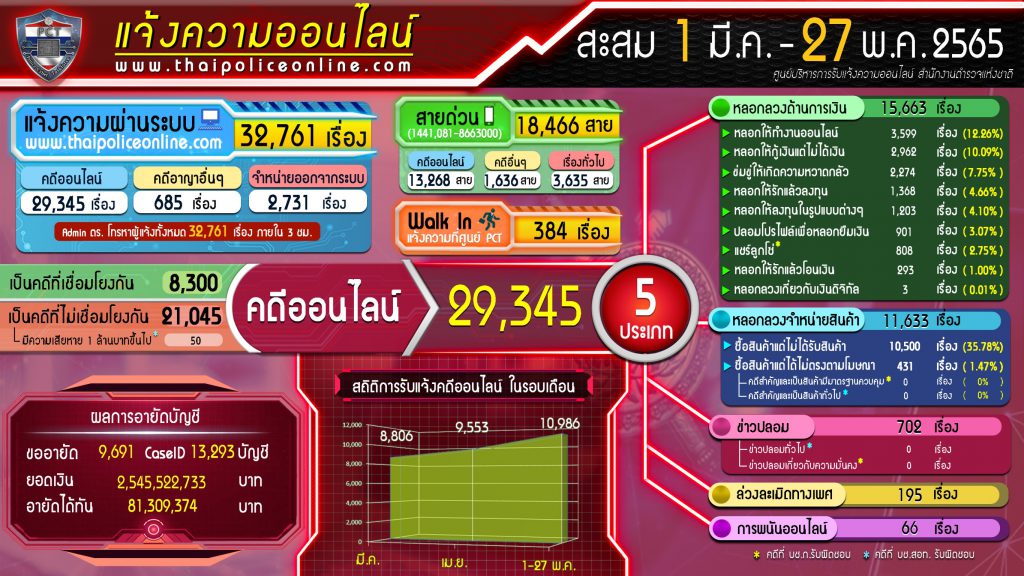 จากสถิติคดีออนไลน์ที่เกิดขึ้นนับตั้งแต่ พล.ต.อ.สุวัฒน์ แจ้งยอดสุข ผบ.ตร. สั่งการให้มีศูนย์รับแจ้งความออนไลน์ เมื่อวันที่ 1 มี.ค.- 27 พ.ค.65 พบว่า มีผู้เสียหายแจ้งความแล้ว 29,345 ราย แบ่งเป็นความผิดเกี่ยวกับ 1.) ซื้อสินค้าแต่ไม่ได้รับสินค้า 10,500 คดี 2.) หลอกให้ทำงานออนไลน์ (เช่น ให้รีวิวสินค้า,กดไลท์ Tiktok, กดไลท์สินค้า) 3,599 คดี, 3.) หลอกให้กู้เงินแต่ไม่ได้เงิน 2,962 คดี, 4.) ข่มขู่ให้เกิดความหวาดกลัว (Call Center) 2,274 คดี, 5.) หลอกให้รักแล้วลงทุน (Hybrid scam) 1,368 คดี, 6.) หลอกให้ลงทุนในรูปแบบต่างๆ 1,203 คดี, 7.) ปลอมโปรไฟล์เพื่อหลอกยืมเงิน 901 คดี, 8.) แชร์ลูกโซ่ 808 คดี, 9.) ซื้อสินค้าแต่ได้ไม่ตรงตามโฆษณา (ไม่ตรงปก) 431 คดี และ 10.) หลอกให้รักแล้วโอนเงิน 293 คดี