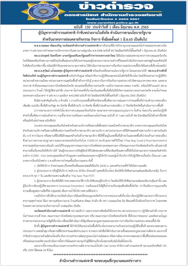 วันที่ 1 มิถุนายน 2565 ที่สำนักงานตำรวจแห่งชาติ(ตร.)พ.ต.อ.กฤษณะ พัฒนเจริญ รองโฆษกสำนักงานตำรวจแห่งชาติกล่าวถึงตามที่มีราชกิจจานุเบกษาเผยแพร่ข้อกำหนดออกตามความในมาตรา 9 แห่ง พระราชกำหนดการบริหารราชการในสถานการณ์ฉุกเฉิน พ.ศ.2548 (ฉบับที่ 45) โดยมีผลบังคับใช้ตั้งแต่วันที่ 1 มิถุนายน 65 เป็นต้นไปพล.อ.ประยุทธ์ จันทร์โอชา นายกรัฐมนตรีและรัฐมนตรีว่าการกระทรวงกลาโหม ได้มีนโยบายผ่อนคลายมาตรการควบคุมและป้องกันโรคให้สอดคล้องกับสถานการณ์ปัจจุบันเพื่อผ่อนปรนให้ประชาชนและผู้ประกอบการสามารถดำรงชีวิตและดำเนินกิจกรรมทางเศรษฐกิจและสังคมได้ใกล้เคียงกับปกติมากขึ้น พร้อมได้กำชับทุกหน่วยงาน ทุกภาคส่วน ให้ดำเนินการตามมาตรการป้องกันการแพร่ระบาดเชื้อไวรัสในส่วนที่เกี่ยวข้องต่อไป