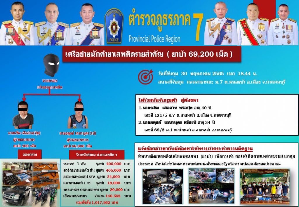 ผบช.ภ.7 กล่าวว่า เจ้าหน้าที่ชุดปฏิบัติการปราบปรามยาเสพติด ภ.7, เจ้าหน้าที่ตำรวจ กก.ปพ.บก.สส.ภ.7, ชุดปฏิบัติการ กก.สส.1 บก.สส.ภ.7 จัดหาสายลับติดต่อสั่งซื้อยาเสพติดจากกลุ่มบุคคลในเครือข่ายดังกล่าว นำไปสู่การจับกุมบุคคลในเครือข่าย ทำการขยายผลจับกุมบุคคลในเครือข่ายยาเสพติด ผู้ต้องหาจำนวน 2 ราย ตาม พ.ร.บ.ให้ใช้ประมวลกฎหมายยาเสพติด พ.ศ. 2564 มาตรา 153 และ ดำเนินการตรวจยึดทรัพย์สินตามประมวลกฎหมายวิธีพิจารณาคดียาเสพติด พ.ศ.2564 มาตรา 11/1 จำนวน 9 รายการประกอบด้วย 1.) รถยนต์ ยี่ห้อ Isuzu รุ่น D-max สี ดำ ทะเบียน ผข 3655 ราชบุรี(ราคาประมาณ 400,000 บาท), 2.) รถจักรยานยนต์ ยี่ห้อ ฮอนด้า รุ่นเวฟ 125 i ทะเบียนป้ายแดง รวย 8806 ฮอนด้ากาญจนบุรี (ราคาประมาณ 60,000 บาท), 3.) รถจักรยานยนต์ ยี่ห้อ Yamaha รุ่น R15 สี ดำ ทะเบียน 3ขอ 6638 กทม (ราคาประมาณ 95,000 บาท), 4.) รถจักรยานยนต์ ยี่ห้อ Kawasaki รุ่น ninja300 สีเขียว ไม่ติดแผ่นป้ายทะเบียน (ราคาประมาณ 250,000 บาท), 5.) สร้อยคอลักษณะคล้ายทองคำ น้ำหนัก 1 บาท (ราคาประมาณ 34,000 บาท), 6.) แหวนลักษณะคล้ายทองคำ น้ำหนัก 2 สลึง (ราคาประมาณ 18,000 บาท), 7.) พระเครื่อง หุ้มกรอบลักษณะคล้ายทองคำ 1 องค์(ราคาประมาณ 20,000 บาท), 8.) บัญชีธนาคาร ไทยพาณิชย์ เลขที่บัญชี 975-2-42586-9 จำนวน เงินในบัญชี 116,862.78 บาท, 9.) บัญชีธนาคาร ไทยพาณิชย์ เลขที่บัญชี 607-2-89448-1 จำนวน เงินในบัญชี 23,700.86 บาทรวมทรัพย์สินที่ตรวจยึดทั้งหมด จำนวน 1,017,562 บาท