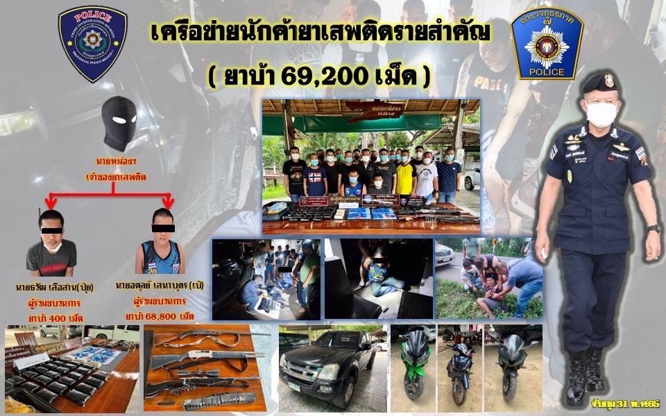วันที่ 1 มิถุนายน 2565 ที่ บช.ภ.7 อ.เมืองนครปฐม จ.นครปฐม พล.ต.ท.ธนายุตม์ วุฒิจรัสธำรงค์ ผบช.ภ.7 พร้อมด้วย พล.ต.ต.บุญญฤทธิ์ รอดมา รอง.ผบช.ภ.7 พล.ต.ต.ปรัชญา ประสานสุข รอง ผบช.ภ.7 และเจ้าหน้าที่ตำรวจที่เกี่ยวข้องได้ร่วมกันแถลงข่าวจับกุมตัวผู้ต้องหา เครือข่ายผู้ค้ายาเสพติดรายสำคัญ “เครือข่ายนายหม่องลือ” จำนวน 2 ราย 1.) นายธวัฒหรือปุ้ย เสือส่าน อายุ 40 ปี (ผู้ต้องหาที่1) ในข้อหา“จำหน่ายซึ่งยาเสพติดให้โทษประเภท 1 (ยาบ้า) โดยการมีไว้ในความครอบครองเพื่อจำหน่าย โดยไม่ได้รับอนุญาต”, 2.) นายอดุลย์หรือเป้ เสนาบุตร อายุ 34 ปี ในข้อหา “จำหน่ายซึ่งยาเสพติดให้โทษประเภท 1 (ยาบ้า) โดยการมีไว้ในความครอบครองเพื่อจำหน่าย โดยมีอาวุธหรือใช้อาวุธเพื่อการค้า ก่อให้เกิดเหตุการณ์แพร่กระจายในกลุ่มประชาชน อันก่อให้เกิดผลกระทบต่อความมั่นคงของรัฐ หรือความปลอดภัยของประชาชน และมีอาวุธและเครื่องกระสุนปืนไว้ในความครอบครองโดยไม่ได้รับอนุญาต”