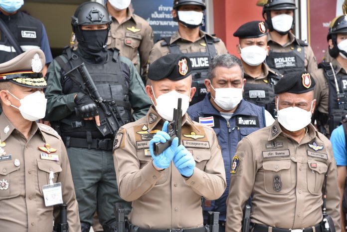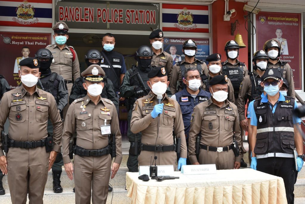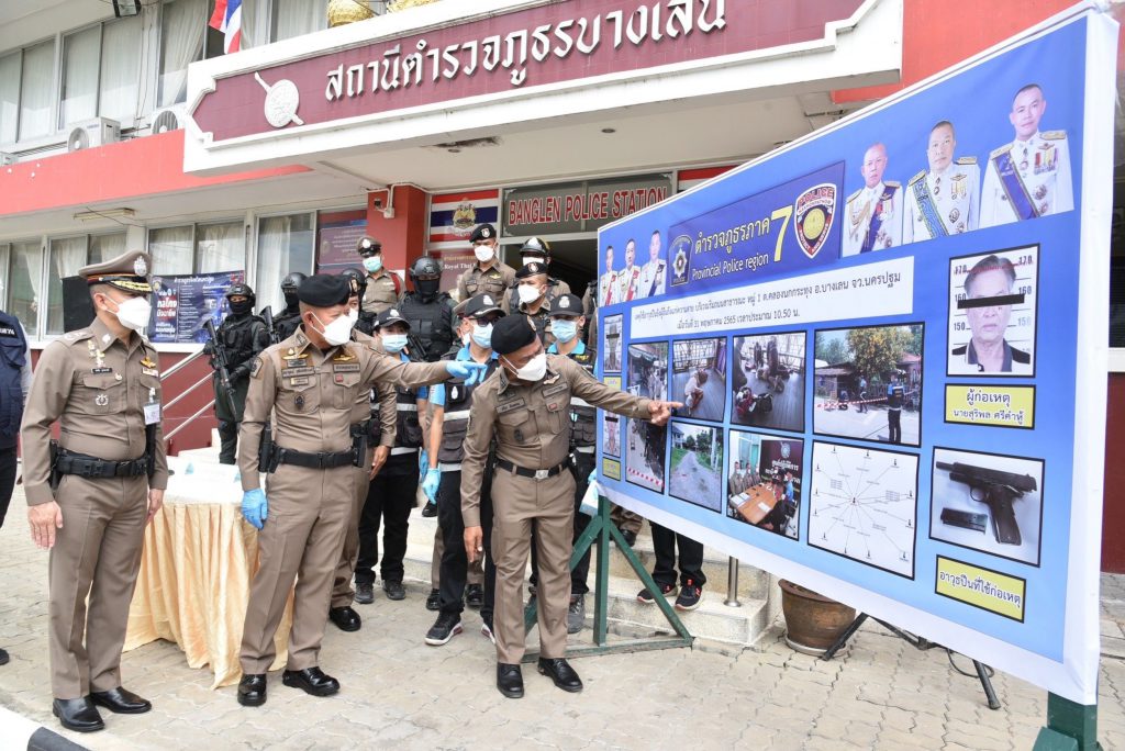 วันที่ 4 มิถุนายน 2565 เวลา 13.00 น.ที่ สภ.บางเลน ต.บางเลน อ.บางเลน จ.นครปฐม พล.ต.ท.ธนายุตม์ วุฒิจรัสธำรงค์ ผบช.ภ.7 พร้อมด้วย พล.ต.ต.ชมชวิณ ปุระธนานนท์ผบก.ภ.จว.นครปฐม ,พ.ต.อ.พงษกร อุปพงษ์ รอง ผบก.ภ.จว.นครปฐม,พ.ต.อ.ปรีชา ทิมหอม,ผกก.สภ.บางเลน,พ.ต.อ.ธนบดี บุญพานวท.(สบ.4)กลุ่มงานตรวจสถานที่เกิดเหตุและเจ้าหน้าที่ที่เกี่ยวข้องได้ร่วมกันแถลงข่าวการจับกุมตัวผู้ต้องหาตามหมายจับ จำนวน 1 ราย ซึ่งก่อเหตุอุกฉกรรจ์สะเทือนขวัญใช้อาวุธปืนยิงผู้อื่นมีเสียชีวิต 1 ราย และผู้บาดเจ็บ 1 ราย คือ1 นายสุริพล ศรีคำหู้ อายุ 75 ปี ผู้ต้องหาหมายจับศาลจังหวัดนครปฐม ที่ จ.149/2565 ลงวันที่ 1 มิถุนายน 2565 พร้อมด้วยของกลาง(1.)อาวุธปืนพกสั้นออโตเมติก ยี่ห้อ Colt ขนาด .38 ซุปเปอร์ หมายเลขทะเบียน นฐ 4/8449 ของผู้ต้องหาที่ใช้ก่อเหตุ จำนวน 1 กระบอก (2.)ซองบรรจุกระสุน จำนวน 2 ซองโดยแจ้งข้อกล่าวหาว่า ข้อหา “ฆ่าและพยายามฆ่าผู้อื่น และพาอาวุธปืนติดตัวไปในเมือง หมู่บ้านหรือทางสาธารณะโดยไม่ได้รับอนุญาตให้มีอาวุธปืนติดตัว และยิงปืนซึ่งใช้ดินระเบิดโดยใช่เหตุในเมือง หมู่บ้าน หรือที่ชุมชน”