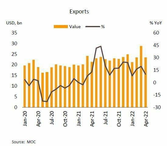 แม้การส่งออกจะได้ปัจจัยบวกจากการทยอยเปิดประเทศในภูมิภาคอาเซียน แต่การส่งออกไปตลาดสำคัญทั้งจีนและสหภาพยุโรปในเดือนเมษายนกลับมาหดตัวเป็นครั้งแรกในรอบปีกว่า ผลกระทบจากเศรษฐกิจจีนที่ชะลอลงจากมาตรการปิดเมืองสำคัญที่มีการระบาดของโควิด-19 และสถานการณ์ความขัดแย้งระหว่างรัสเซีย-ยูเครน รวมถึงมาตรการคว่ำบาตรต่อรัสเซียที่ส่งผลต่อการชะงักงันของห่วงโซ่การผลิต วิจัยกรุงศรีประเมินแนวโน้มการส่งออกในช่วงที่เหลือของปียังคงได้รับแรงกดดันจากเศรษฐกิจและการค้าโลกที่ชะลอลง โดยองค์การการค้าโลก (WTO) ล่าสุดได้ปรับลดคาดการณ์ปริมาณการค้าโลก