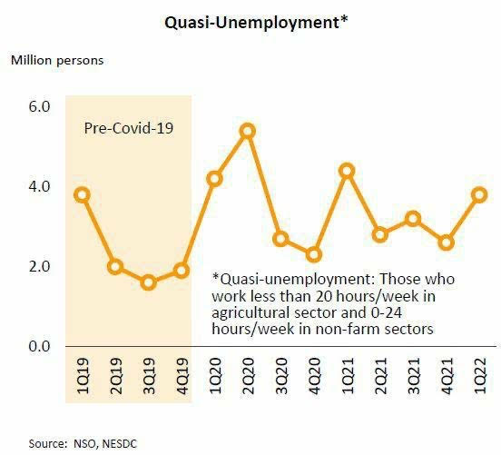 ในไตรมาส 1/2565 มีการปรับดีขึ้นทั้งในภาคเกษตร และนอกภาคเกษตร ทั้งสาขาการผลิต การค้าส่งและค้าปลีก และโลจิสติกส์ ส่วนการจ้างงานในสาขาก่อสร้าง โรงแรม และร้านอาหารยังหดตัวเล็กน้อย อย่างไรก็ตาม แม้สถานการณ์การระบาดคลี่คลายลง กิจกรรมทางเศรษฐกิจทยอยกลับมาดำเนินการ โดยเฉพาะธุรกิจที่เกี่ยวข้องกับภาคท่องเที่ยวซึ่งคาดว่าจะช่วยหนุนให้เกิดการจ้างงานตามมาแต่ยังต้องใช้เวลากว่าจะกลับมาเท่ากับระดับก่อนเกิดการระบาด เนื่องจากจำนวนผู้เสมือนว่างงานหรือผู้ที่ทำงานน้อยกว่า 4 ชั่วโมงต่อ