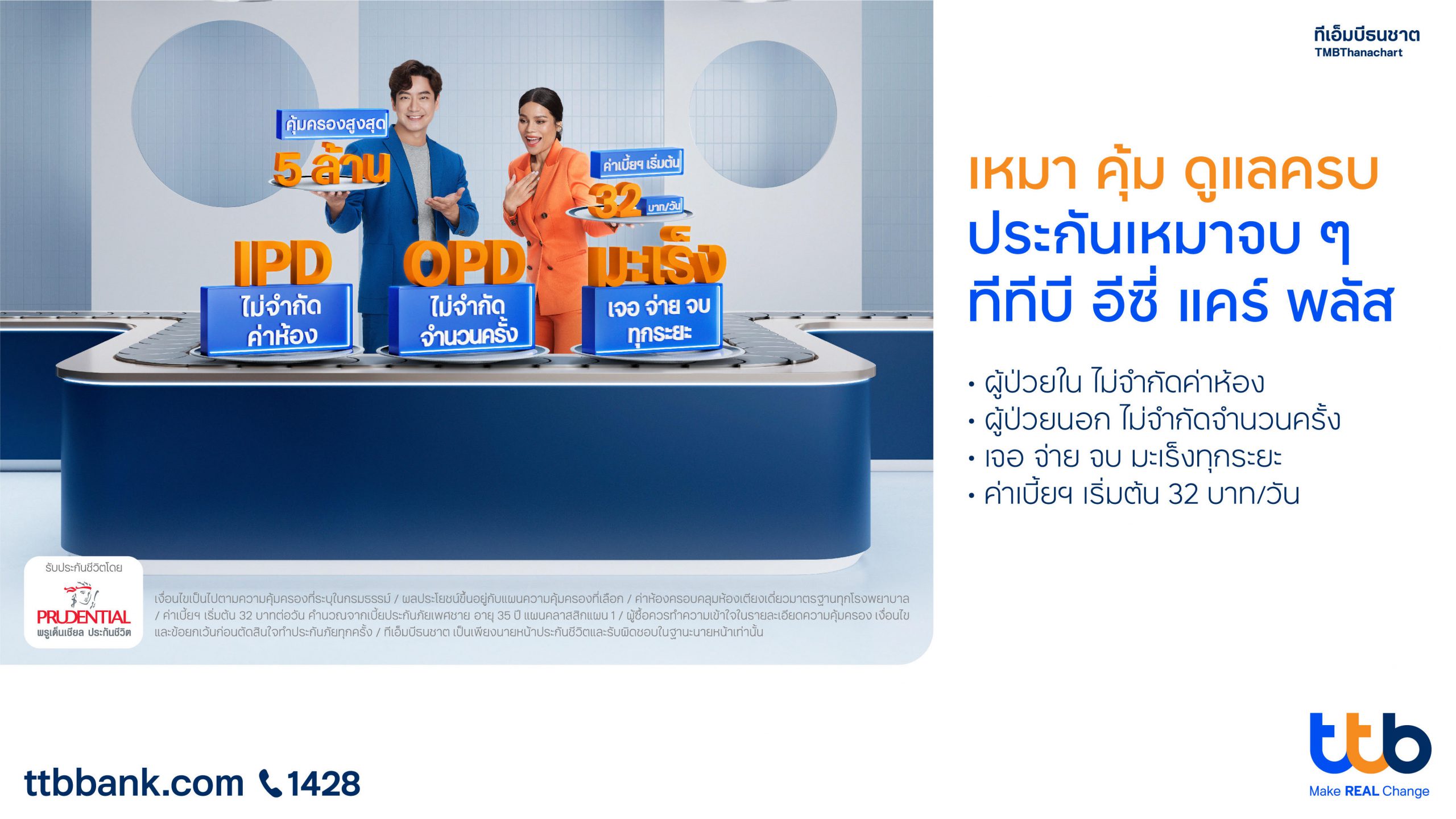 ทีเอ็มบีธนชาต จับมือพันธมิตรทางธุรกิจ พรูเด็นเชียล ประเทศไทย ชูกลยุทธ์การตลาดผลิตภัณฑ์ “ทีทีบี อีซี่ แคร์ พลัส ประกันเหมาจบ ๆ” เปิดตัวโฆษณา พรีเซนเตอร์ของแคมเปญ “โอปอล์ -หมอโอ๊ค” เน้นการโปรโมทด้วยช่องทางสื่อออนไลน์และสื่อที่โรงพยาบาล พร้อมทั้งนำเสนอความคุ้มครองแบบเหมา ๆ ที่ครบทั้งค่ารักษาผู้ป่วยใน ผู้ป่วยนอก และมะเร็งทุกระยะ ควบคู่การทำตลาดผ่านช่องทางสาขาธนาคาร ตอกย้ำภาพลักษณ์ของผลิตภัณฑ์ และเป็นตัวแทนครอบครัวของคนยุคใหม่ ที่ใส่ใจการดูแลสุขภาพ ด้วยการเลือกประกันชีวิตและสุขภาพที่ออกแบบความคุ้มครองให้พอดีได้ด้วยตนเอง มอบความอุ่นใจให้ลูกค้าสามารถใช้ชีวิตได้ตามแผนที่ต้องการ สร้างรากฐานที่มั่นคง เพื่อให้มีชีวิตทางการเงินที่ดีขึ้นทั้งวันนี้และอนาคต และยังมีโปรโมชันพิเศษสำหรับผู้ที่ซื้อประกันชีวิตและสุขภาพ ทีทีบี อีซี่ แคร์ พลัส และชำระค่าเบี้ยประกันภัยแบบรายปี ตั้งแต่วันที่ 1 เม.ย.65 ถึง 31 ธ.ค. 65 รับสิทธิพิเศษ 3 ต่อ คือ ต่อที่ 1 รับเงินคืนเข้าบัญชีสูงสุด 3,000 บาท ต่อที่ 2 รับเพิ่มเครดิตเงินคืน 20% ของค่าเบี้ยประกันภัยรายปี ปีแรก เมื่อชำระค่าเบี้ยประกันภัยด้วยบัตรเครดิตทีทีบี และต่อที่ 3 แบ่งจ่าย 0% ได้นาน 6 เดือนอีกด้วย