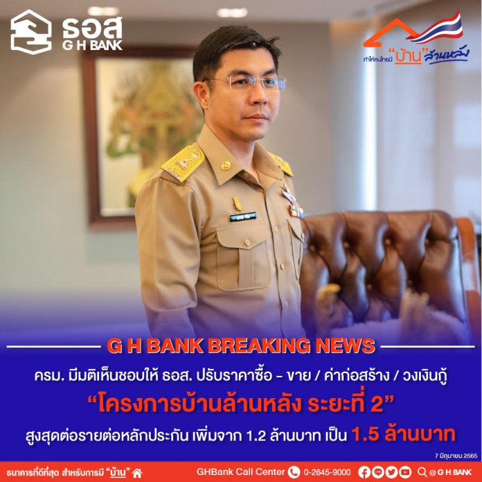 นายฉัตรชัย ศิริไล กรรมการผู้จัดการ ธนาคารอาคารสงเคราะห์ (ธอส.) เปิดเผยว่า ที่ประชุมคณะรัฐมนตรี (ครม.) ที่มีพลเอก ประยุทธ์ จันทร์โอชา นายกรัฐมนตรี และรัฐมนตรีว่าการกระทรวงกลาโหมเป็นประธานการประชุมในวันนี้ (7 มิถุนายน 2565) มีมติเห็นชอบตามที่กระทรวงการคลังเสนอให้ ธอส. ปรับปรุงการกำหนดราคาซื้อ – ขาย / ค่าก่อสร้าง และปรับวงเงินกู้ “โครงการบ้านล้านหลัง ระยะที่ 2 ” สูงสุดต่อรายต่อหลักประกัน เพิ่มจากเดิมไม่เกิน 1,200,000 บาท เป็นไม่เกิน 1,500,000 บาท เพื่อให้ประชาชนมีทางเลือก