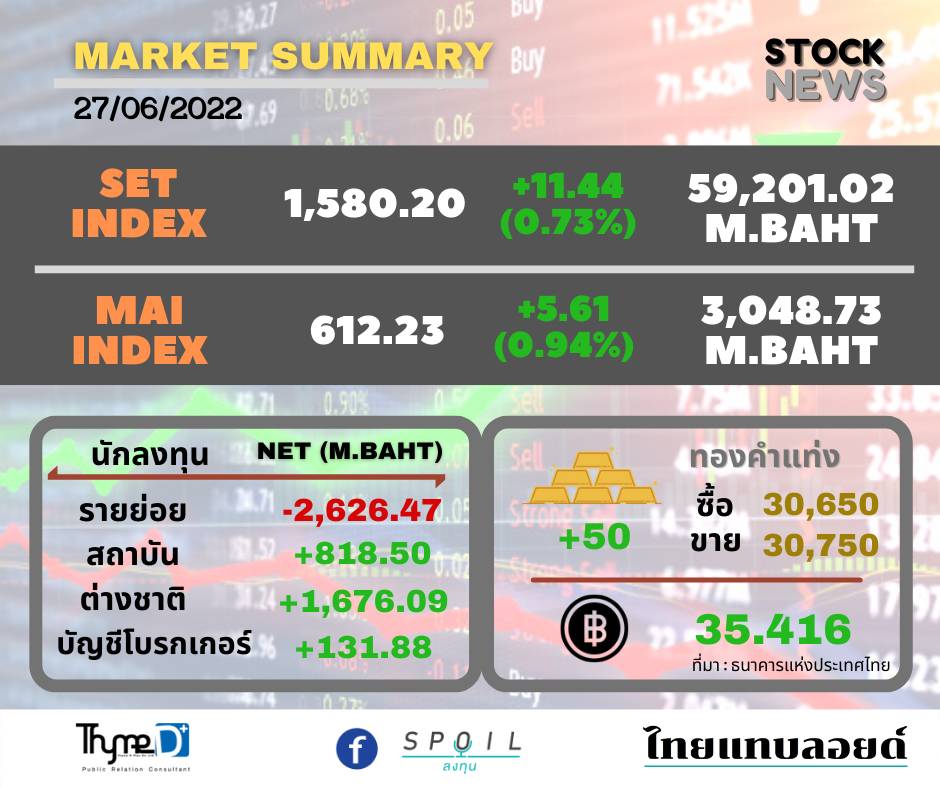 ภาวะการลงทุนในตลาดหลักทรัพย์ไทย ประจำวันที่ 27 มิถุนายน 2565