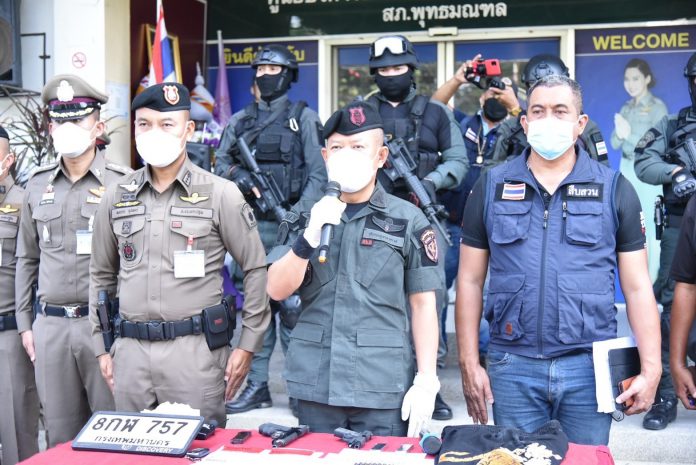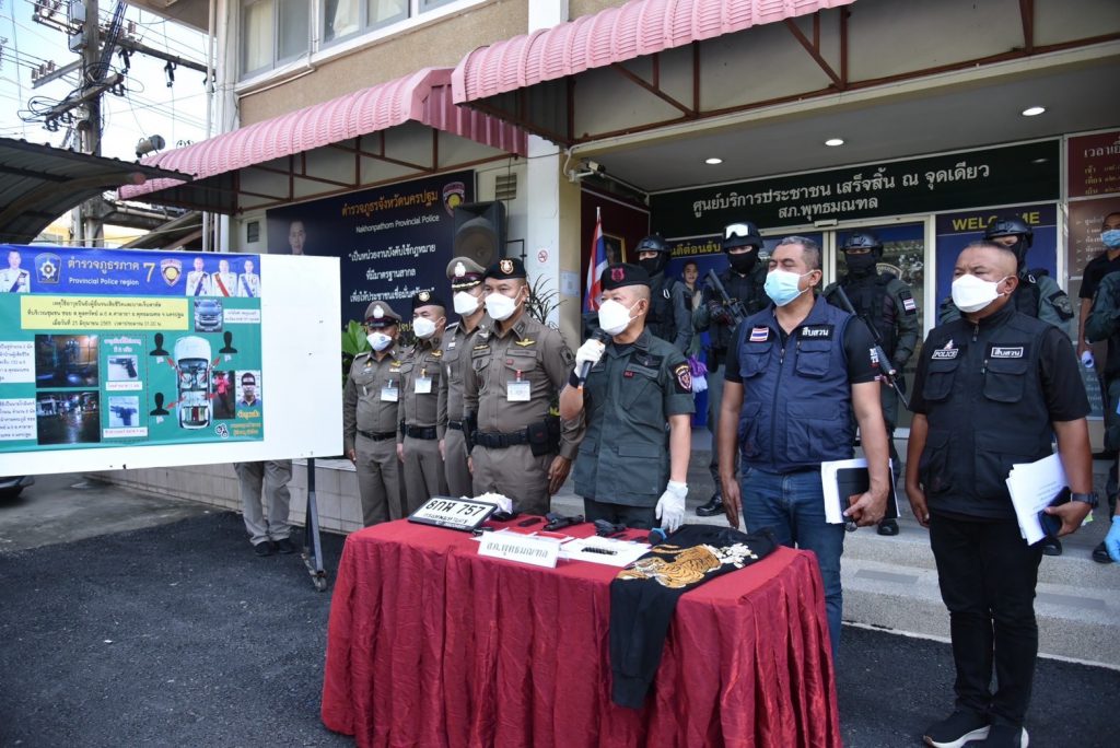 วันที่ 29 มิถุนายน 2565 เวลา 09.00 น. ที่ สภ.พุทธมณฑล ต.ศาลายา อ.พุทธมณฑล จ.นครปฐม พล.ต.ท.ธนายุตม์ วุฒิจรัสธำรงค์ ผบช.ภ.7 พร้อมด้วย พ.ต.อ.พงษกร อุปพงษ์ รอง ผบก.ภ.จว.นครปฐม, พ.ต.อ.จุลภณ มีชำนาญ ผกก.สภ.พุทธมณฑล, พ.ต.อ.ไพรัตน์ รอดทอง ผกก.กลุ่มงานสอบสวน บก.สส.ภ.7, พ.ต.อ.ธนบดี บุญพาน วท.(สบ.4)กลุ่มงานตรวจสถานที่เกิดเหตุ ศพฐ.7 และเจ้าหน้าที่ที่เกี่ยวข้อง ร่วมกันแถลงข่าวการจับกุมตัวผู้ต้องหา ซึ่งก่อเหตุอุกฉกรรจ์สะเทือนขวัญใช้อาวุธปืนยิงผู้อื่นมีเสียชีวิต 1 ราย และผู้บาดเจ็บ 1 ราย ผู้ต้องหา คือ นายภาณุพงศ์ หรือแมน สรรพนา อายุ 23 ปี ผู้ต้องหาหมายจับศาลจังหวัดนครปฐม ที่ จ.205/2565 ลงวันที่ 25 มิถุนายน 2565 ข้อหา “ร่วมกันฆ่าผู้อื่นโดยไตร่ตรองไว้ก่อน, ร่วมกันพยายามฆ่าผู้อื่นโดยไตร่ตรองไว้ก่อน, ร่วมกันมีอาวุธปืน เครื่องกระสุนปีนไว้ในครอบครองโดยไม่ได้รับอนุญาต, ร่วมกันพาอาวุธปืนติดตัวไปในเมือง หมู่บ้านหรือทางสาธารณะโดยไม่มีเหตุจำเป็นเร่งด่วนตามสมควรแก่พฤติการณ์โดยไม่ได้รับอนุญาตให้มีอาวุธปีนติดตัว, ร่วมกันยิงปีนซึ่งใช้ดินระเบิดโดยใช่เหตุในเมือง หมู่บ้านหรือที่ชุมชน” พร้อมด้วยของกลางในคดี (1.) รถยนต์นั่งส่วนบุคคลไม่เกิน 7 คน ยี่ห้อโตโยต้า รุ่นฟอร์จูนเนอร์ สีขาว หมายเลขทะเบียน 8กฬ – 757 กรุงเทพมหานคร จำนวน 1 คัน, (2.) อาวุธปืนพกสั้น ขนาด 9 มม. สีดำ ยี่ห้อชิกชาวเออร์ รุ่น พี 938 หมายเลขทะเบียน กท 5610458 จำนวน 1 กระบอก, (3.) อาวุธปืนพกสั้นกึ่งอัติโนมัติ ยี่ห้อ COLT GOVERNMENT MODEL ขนาด .45 มม. ไม่มีหมายเลขทะเบียนปืน และไม่มีหมายเลขประจำปืน จำนวน 1 กระบอก (ที่ใช้ในการก่อเหตุ, (4.) ชองบรรจุกระสุน ขนาด 9 มม. จำนวน 2 ซอง(5.)เครื่องกระสุนปืน ขนาด 9 มม. จำนวน 12 นัด, (6.) ปลอกกระสุนปืน ขนาด .38 จำนวน 1 ปลอก, (7.) กางเกงขายาวสีดำลายเสือ จำนวน 1 ตัว (8.)แผ่นป้ายทะเบียนรถ หมายเลขทะเบียน 8กฬ – 757 กรุงเทพมหานคร จำนวน 1 แผ่นป้าย