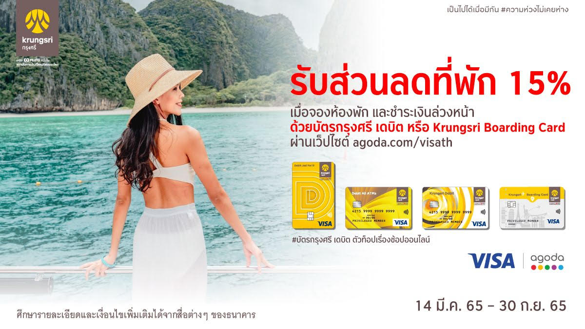 กรุงศรี (ธนาคารกรุงศรีอยุธยา จำกัด (มหาชน)) ชวนเที่ยวรับวันหยุดยาวกับแคมเปญ ดีลดีโดนใจ รับส่วนลดที่พัก 15% เมื่อจองห้องพัก และชำระเงินล่วงหน้าผ่านเว็บไซต์ agoda.com/visath ด้วยบัตรกรุงศรี เดบิต หรือ Krungsri Boarding Card โดยส่วนลด 15% นี้ สำหรับค่าห้องพักเท่านั้น (ไม่รวมภาษีท้องถิ่น ค่าบริการและค่าใช้จ่ายเพิ่มเติม) และใช้ได้เฉพาะกับโรงแรมที่กำหนดในจุดหมายปลายทางทั่วโลก จำกัดส่วนลดสูงสุดไม่เกิน 1,500 บาทต่อการจองต่อครั้ง ข้อกำหนดและเงื่อนไขการใช้บัตรกรุงศรี เดบิต และ Krungsri Boarding Card เป็นไปตามที่ธนาคารกำหนด