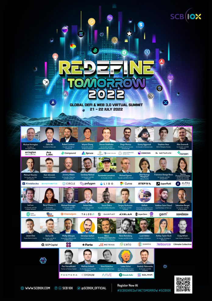 SCB 10X เปิดเวที Virtual Summit “REDeFiNE TOMORROW 2022” ปีที่ 3 ขนทัพสุดยอดกูรูด้าน DeFi และ Web 3.0 ระดับโลกมาให้ความรู้และ ชี้โอกาสในการเติบโตเกี่ยวกับDeFi และ Web 3.0 ในช่วงตลาดผันผวน