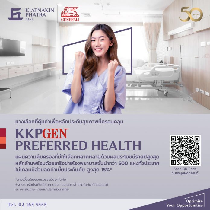พื้นฐานที่จำเป็น ทั้งยัง ออกแบบมาให้ลูกค้ามีทางเลือกหลากหลายตามความต้องการ ไม่ว่าจะเพื่อแบ่งเบาภาระค่าใช้จ่าย หรือเติมเต็มความคุ้มครองด้านสุขภาพที่มีอยู่แล้วให้ครอบคลุมมากยิ่งขึ้น ดังนั้น ลูกค้าแทบทุกกลุ่ม ไม่ว่าจะเป็นเจ้าของกิจการ พนักงานบริษัท หรืออาชีพอิสระก็สามารถใช้ KKPGEN PREFERRED HEALTHปกป้องความมั่งคั่ง สร้างหลักประกันทางสุขภาพได้”