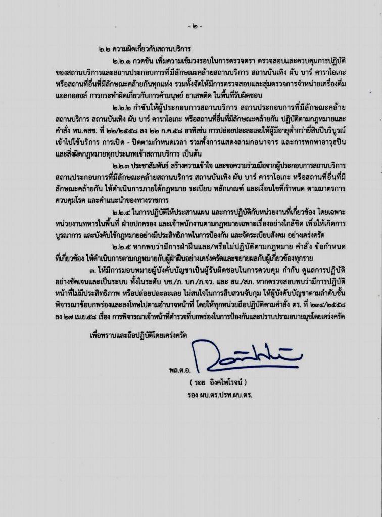วันที่ 6 กรกฎาคม 2565 ที่สำนักงานตำรวจแห่งชาติ(ตร.) พล.ต.อ.รอย อิงคไพโรจน์ รอง ผบ.ตร.(ปป.)ได้มีคำสั่งเป็น วิทยุในราชการสำนักงานตำรวจแห่งชาติ ด่วนที่สุด ถึง ผบช.น. ภ.1-9 ก. ทท. ปส. สตม. ตชด. และ สยศ.ตร.ลงวันที่ 6 ก.ค.2565 ระบุ ว่า อ้างถึงคำสั่ง หน.คสช. ที่ 22/2558 ลง 22 ก.ค.58 เรื่อง มาตรการในการป้องกันและแก้ไขปัญหาการแข่งรถยนต์และรถจักรยานยนต์ในทางและการควบคุมสถานบริการหรือสถานประกอบการที่เปิดให้บริการในลักษณะที่คล้ายสถานบริการ และคำสั่ง หน.คสช. ที่ 46/2559 ลง 29 ก.ค.59 เรื่อง แก้ไขเพิ่มเติมคำสั่งหัวหน้าคณะรักษาความสงบแห่งชาติ ที่ 22/2558ตามข้อกำหนด ออกตามความในมาตรา 9 แห่งพระราชกำหนดการบริหารราชการในสถานการณ์ฉุกเฉิน พ.ศ.2548 (ฉบับที่ 46!) ลง 23 มิ.ย.65 ประกาศปรับลดระดับพื้นที่สถานการณ์ทั่วราชอาณาจักรผ่อนคลายมาตรการควบคุมและป้องกันโรคให้สอดคล้องกับสถานการณ์ปัจจุบันและการขับเคลื่อนกิจกรรมทางเศรษฐกิจควบคู่กับการคงดำเนินมาตรการที่จำเป็นสำหรับป้องกันและควบคุมโรค รวมทั้งเพิ่มมาตรการ เฝ้าระวังโรคต่อไปอีกช่วงระยะเวลาหนึ่งเพื่อควบคุมการระบาดของโรคให้เป็นไปอย่างมีประสิทธิภาพสูงสุด และตามหนังสือ ตร. ที่ 007.22/523 ลง 8 ก.พ.2565 เรื่อง กำชับการปฏิบัติในการป้องกันปราบปราม และแก้ไขปัญหาการพนัน วิทยุ ตร. ด่วนที่สุด ที่ 007.22 /2289 ลง 1 มิ.ย.2565 กำชับการปฏิบัติเกี่ยวกับสถานประกอบการมีลักษณะคล้ายสถานบริการ สถานบันเทิง ผับ บาร์ คาราโอเกะ หรือสถานที่อื่นที่มีลักษณะคล้ายกัน