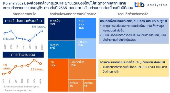 อย่างไรก็ดี ในช่วงครึ่งปีหลัง 2565 นี้ ศูนย์วิเคราะห์เศรษฐกิจ ทีทีบี หรือ ttb analytics คาดว่าทางการจีนจะเริ่มผ่อนคลายมาตรการควบคุมสถานการณ์โควิด-19 โดยเริ่มเปิดเมืองมากขึ้น ทำให้การส่งออกของไทยผ่านแดนไปจีนตอนใต้ทยอยฟื้นกลับมา นอกจากนี้ คาดว่าจะได้รับปัจจัยบวกจากการเปิดให้บริการรถไฟความเร็วสูงจากจีนถึง สปป.ลาว ที่เวียงจันทน์ติดกับจังหวัดหนองคาย เพิ่มยอดการส่งออกทางค้าผ่านแดนทั้งปี 2565 อยู่ที่ 3.7 แสนล้านบาท ลดลง 20% จากปี 2564 และทำให้ภาพรวมสถานการณ์ส่งออกทางค้าชายแดนและผ่านแดนทั้งปี 2565 มีมูลค่า 1.02 ล้านล้านบาท ใกล้เคียงกับการส่งออกของปี 2564