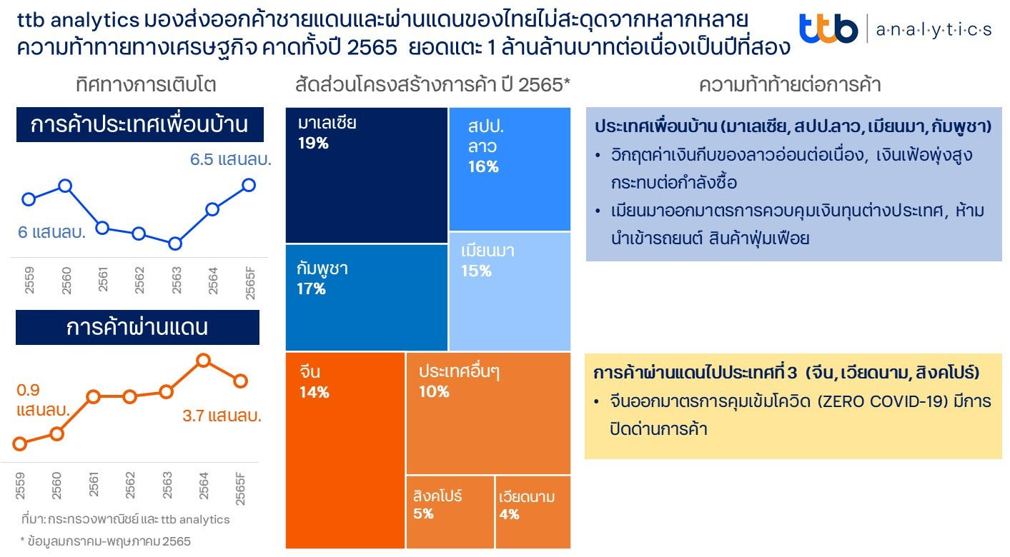 ตั้งแต่ปี 2563 การค้าชายแดนและผ่านแดนของไทยอยู่ในภาวะซบเซาเนื่องจากมีการปิดจุดผ่านแดนในช่วงการแพร่ระบาดของโรคโควิด-19 ในปี 2564 แม้ยังมีการแพร่ระบาดอยู่ แต่การส่งออกทางชายแดนไปยังประเทศเพื่อนบ้านและผ่านแดนไปยังประเทศที่สามกลับเติบโตสวนกระแสแตะ 1 ล้านล้านบาท สำหรับในปี 2565 ทั้งไทยและประเทศเพื่อนบ้านต่างมีมาตรการผ่อนปรนการข้ามแดนและผ่านแดนระหว่างกัน ทำให้เป็นโอกาสของการค้าชายแดนที่จะสามารถฟื้นตัวได้ อย่างไรก็ดี จากปัญหาด้านเศรษฐกิจการเงินของประเทศคู่ค้า ได้แก่ สาธารณรัฐประชาธิปไตยประชาชนลาว (สปป.ลาว) และเมียนมา รวมถึงมาตรการคุมเข้มโควิดของจีน เป็นโจทย์ท้าทายการส่งออกทางการค้าชายแดนและผ่านแดนว่าจะสามารถโตต่อเนื่องหรือสะดุดในช่วงครึ่งปีหลังนี้