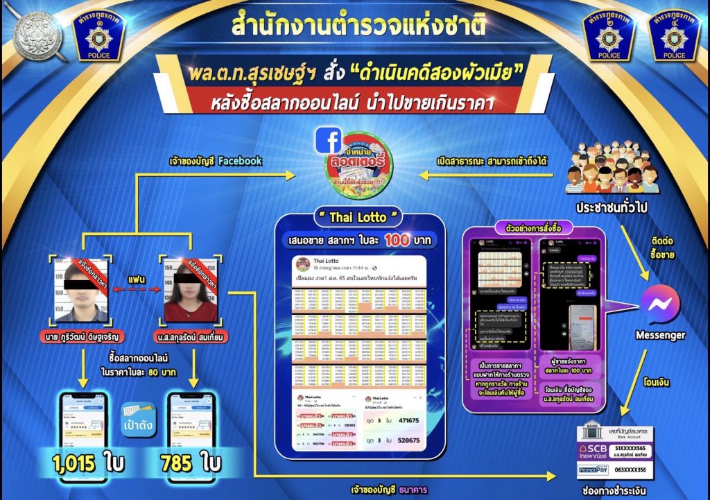 จากการสืบสวนในกรณีดังกล่าวพบว่า ในหน้าเพจเฟซบุ๊ก Thai Lotto ดังกล่าวเป็นเพจของ นายภูริวัฒน์ ดิษฐเจริญ อายุ 34 ปี ได้มีการนำเสนอจำหน่ายสลากกินแบ่งรัฐบาล โดยการให้ลูกค้าเลือกเลขที่ต้องการ แล้วทักแชทเพื่อติดต่อขอซื้อสลากกินแบ่ง ทางเพจก็จะนำภาพสลากกินแบ่งรัฐบาลซึ่งเป็นภาพจากสลากดิจิทัล นำมาให้ลูกค้าเลือกเลข โดยเสนอจำหน่ายฉบับละ 100 บาท โดยให้ชำระเงินโดยการโอนเงินเข้าบัญชีของ น.ส.สกุลรัตน์ สมเกี่ยม ซึ่งเป็นภรรยาของนายภูริวัฒน์ฯ และจากการตรวจสอบเพิ่มเติมพบว่า ทั้งนายภูริวัฒน์ฯ และ น.ส.สกุลรัตน์ฯ ได้มีการซื้อสลากดิจิทัลไปรวมกันจำนวน 1,800 ใบ