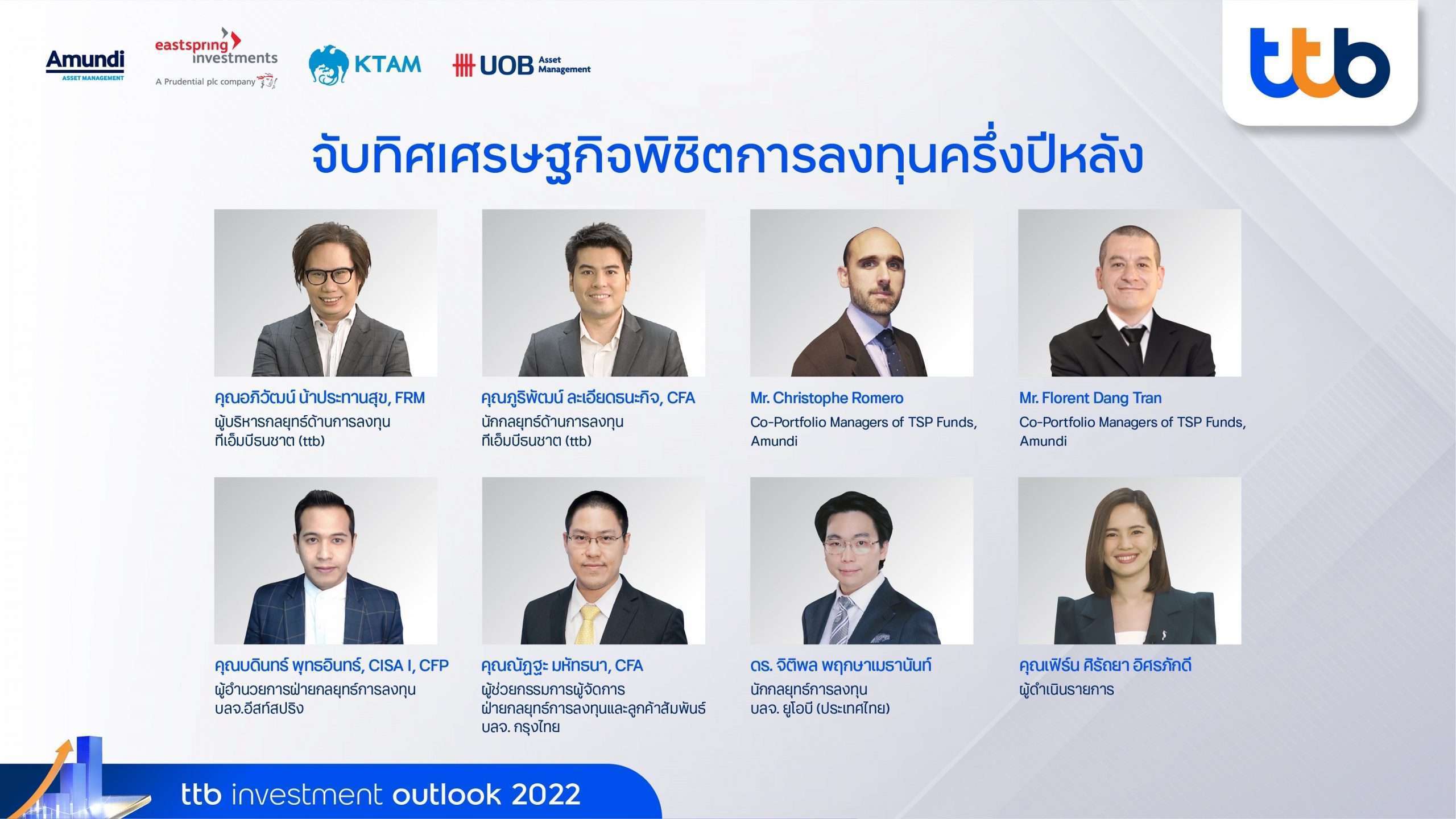เมื่อเร็วๆ นี้ ทีเอ็มบีธนชาต หรือ ทีทีบี จับมือพันธมิตร 4 บริษัทหลักทรัพย์จัดการกองทุนชั้นนำ จัดสัมมนาออนไลน์ “ttb investment outlook 2022 : จับทิศทางเศรษฐกิจพิชิตการลงทุนครึ่งปีหลัง” แนะความรู้สำหรับนักลงทุน เปิดมุมมอง รวมถึงวิเคราะห์ทิศทางตลาด พร้อมเจาะเทรนด์ตลาดพิชิตพอร์ตครึ่งปีหลัง เพื่อช่วยสร้างโอกาสในการได้รับผลตอบแทนที่ดีจากการลงทุน นำไปสู่การมีชีวิตทางการเงินที่ดีขึ้นทั้งในวันนี้ และอนาคต โดยมีกูรูและผู้เชี่ยวชาญด้านการลงทุนจากทีเอ็มบีธนชาต พร้อมด้วย 4 พันธมิตรของธนาคาร ได้แก่ Amundi, บลจ.อีสท์สปริง (ประเทศไทย), บลจ.กรุงไทย และ บลจ.ยูโอบี (ประเทศไทย) มาร่วมให้ความรู้