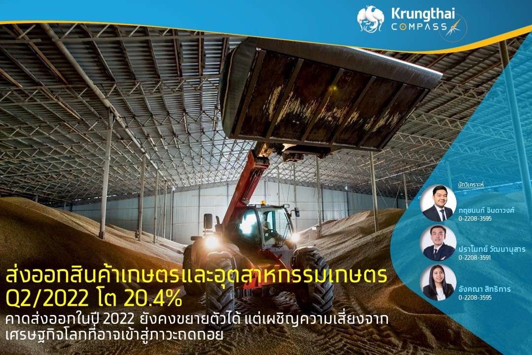 โดยมูลค่าส่งออกสินค้ากลุ่มเกษตรและอุตสาหกรรมเกษตรไตรมาส 2 ปี 2022 ขยายตัว 20.4%YoY แบ่งเป็นหมวดสินค้าเกษตรที่ขยายตัวเร่งขึ้นชัดเจนที่ 15.4%YoY การส่งออกขยายตัวดีในทุกตลาดสำคัญ โดยจีนซึ่งเป็นตลาดใหญ่สุดคิดเป็น 27% ของมูลค่าส่งออกสินค้าเกษตรและอุตสาหกรรมเกษตรทั้งหมดกลับมาเร่งตัวที่ 20%YoY ทั้งนี้ กลุ่มสินค้าที่ขยายตัวดี ได้แก่ มันสำปะหลัง ผลไม้สดแช่เย็นแช่แข็ง และข้าว ขณะที่ตลาดแอฟริกาขยายตัวถึง 31%YoY จากกำลังซื้อที่ฟื้นตัวตามราคาน้ำมันตลาดโลก โดยสินค้าที่ขยายตัวดี ได้แก่ ข้าวนึ่ง ขยายตัวถึง 38.8%YoY